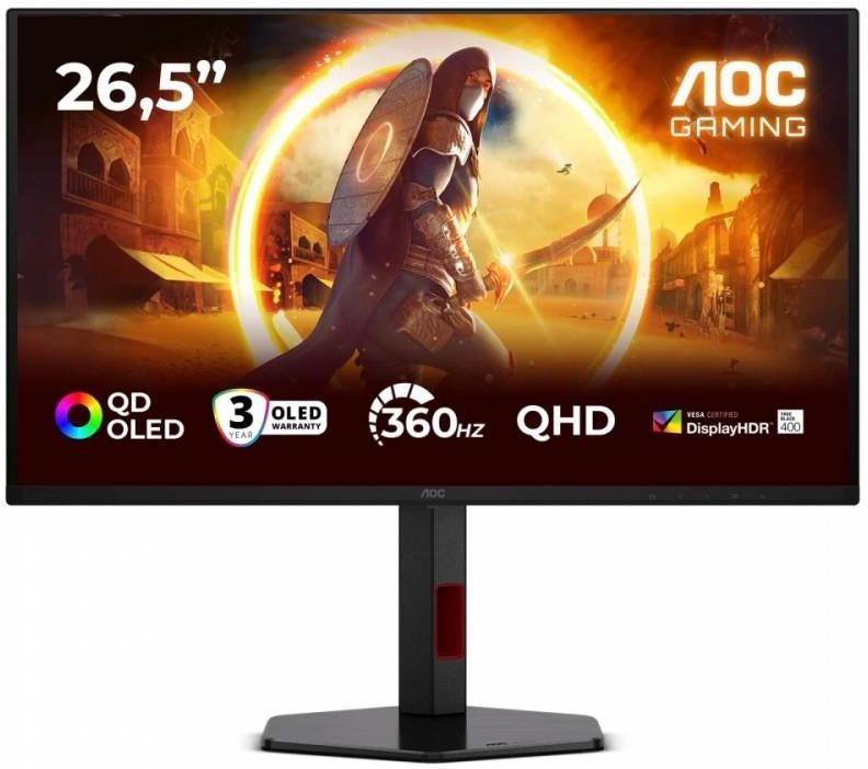 Q27G4SDR Uwolnij swój potencjał Doświadcz niezrównanej prędkości i przejrzystości z monitorem Q27G4SDR QD-OLED, łączącym obrazy QHD 360Hz z jasnością HDR400 TrueBlack. Monitor Q27G4SDR QD-OLED na nowo definiuje granie w wysokiej prędkości dzięki imponującej częstotliwości odświeżania 360 Hz w rozdzielczości QHD. Dzięki technologii QD-OLED zapewnia realistyczne kolory, doskonały kontrast i HDR400 TrueBlack dla niesamowitej głębi i szczegółowości. Ciesz się niskim opóźnieniem wejściowym, kompatybilnością z G-Sync i HDMI 2.1, co zapewnia płynną i responsywną rozgrywkę. Ergonomiczna podstawka, 3-letnia , koncentrator USB i obsługa G-Menu dopełniają pakiet stworzony dla wymagających graczy, którzy oczekują bezkompromisowej wydajności. Trzy lata OLED wliczona: 3 lata (obejmującej ochronę przed wypaleniem OLED*) Więcej informacji znajduje się na stronie z informacjami o . Częstotliwość odświeżania 360 Hz Wyprzedź przeciwnika o krok dzięki sprzętowi nowej generacji! Dzięki imponującej częstotliwości odświeżania 360 Hz Twój monitor wyświetla więcej obrazów na sekundę niż przeciętny ekran. Skorzystaj z rozgrywki płynniejszej i szybszej niż kiedykolwiek wcześniej. Rozdzielczość QHD Dzięki rozdzielczości 2560 x 1440 pikseli Quad HD (QHD) zapewnia najwyższą jakość i ostrość obrazu oraz wysoki poziom jego szczegółowości. Szerokoekranowe proporcje obrazu 16:9 zapewniają wystarczającą ilość miejsca zarówno na aplikacje biurowe, jak i rozrywkę w postaci gier i filmów. EKRAN Z CERTYFIKATEM VESA HDR TRUE BLACK 400 DisplayHDR True Black 400 zapewnia głębsze i dokładniejsze poziomy czerni, dzięki czemu wrażenia wizualne są bogatsze i bardziej wciągające. Koniec z rozmytymi ciemnymi scenami w filmach i grach. Dzięki TrueBlack400 czeka Cię bardziej realistyczna wizualna podróż. HDMI 2.1 Najnowszy standard technologii HDMI pozwala korzystać z jeszcze wyższych częstotliwości odświeżania i rozdzielczości. Zapewnia to nowe możliwości nie tylko podczas oglądania multimediów, ale również podczas gry: HDMI 2.1 pozwala na maksymalne wykorzystanie możliwości oferowanych przez konsole nowej generacji. G-Sync Compatible Umożliwia bezbłędną jakość obrazu poprzez synchronizację nowych generacji kart graficznych NVIDIA* z tym monitorem G-SYNC Compatible. *Skorzystaj z witryny internetowej NVIDIA, aby uzyskać pełną listę kart graficznych współpracujących z monitorami G-SYNC Compatible Niskie opóźnienie sygnału wejściowego Uwolnij swój refleks, przełączając się na Tryb niskiego opóźnienia AOC. Zapomnij o bajerach graficznych: ten tryb przełącza monitor na ustawienia stawiające czysty czas reakcji na pierwszym miejscu, zapewniając decydującą przewagę w wyrównanych starciach, gdy decydują ułamki sekund. ERGONOMICZNY DESIGN Ergonomiczny stojak zapewnia wygodę i zapobiega zmęczeniu podczas długich sesji grania. Oferuje szeroki zakres ruchu oraz łatwą regulację wysokości, pochylenia i obrotu, dostosowując się do odpowiedniej ergonomii i osobistych preferencji. Koncentrator USB Praktyczne koncentratory USB wbudowane w monitory AOC pozwalają uporządkować biurko. Gniazda zamontowane z boku są łatwo dostępne nawet bez patrzenia i eliminują czas marnowany na przeszukiwanie tylnej ścianki komputera w poszukiwaniu wolnego gniazda USB. GMENU Menu G AOC to bezpłatne narzędzie, które można zainstalować na komputerze i cieszyć się pełną personalizacją w połączeniu z maksymalną wygodą. Informacje o produkcie Etykieta energetyczna Pobierz Model Q27G4SDR Proporcje obrazu 16:9 Przekątna ekranu 26.5" Typ matrycy QD OLED Powierzchnia matrycy Matowa Ekran dotykowy Nie Technologia podświetlania Diody LED Plamka matrycy 0.2292 mm Rozdzielczość 2560 x 1440 Czas reakcji 0.03 ms Jasność 1000 cd/m² Kontrast statyczny 1 500 000:1 Częstotliwość odświeżania 360 Hz Częstotliwość pozioma min. 30 kHz Częstotliwość pozioma max. 510 kHz Częstotliwość pionowa min. 48 Hz Częstotliwość pionowa max. 360 Hz Kąt widzenia poziomy 178 ° Kąt widzenia pionowy 178 ° Ilość kolorów 1,07 mld Gniazda we/wy 2 x USB 3.2 Type-A Gen 1 1 x 3,5 mm minijack 2 x HDMI 1 x DisplayPort 1 x USB 3.2 Type-B Gen 1 Kensington Security Slot Tak Bluetooth Nie WiFi Nie Wbudowane głośniki Nie Wbudowany tuner TV Nie Kamera internetowa Brak Mikrofon Nie Pivot Tak Regulacja wysokości Tak Zakres regulacji wysokości 130 mm Certyfikaty WEEE UKCA RoHS TUV CB CE CEC EAC FCC (jeśli nie ma podanej klasy) ISO 9241-307 REACH Standard VESA 100 x 100 Pobór mocy 25 W Klasa energetyczna F Akcesoria w zestawie Kabel HDMI: 1,8 m Kabel Displayport: 1,8 m Kabel do podłączania urządzeń peryferyjnych USB-B: USB-B do A 1,8 m Kabel zasilający Kolor Czarny Wysokość 357.7 mm Wysokość (maks.) 537.4 mm Wysokość z podstawą 407.4 mm Szerokość 609.3 mm Głębokość 58.2 mm Głębokość z podstawą 207.7 mm Waga 4.99 kg Waga z podstawą 6.87 kg Pozostałe parametry Adaptive Sync NVIDIA G-SYNC Compatible VESA Certified DisplayHDR True Black 400 TUV Low Blue Light (hardware) PiP+PbP Flicker Free Oznaczenia