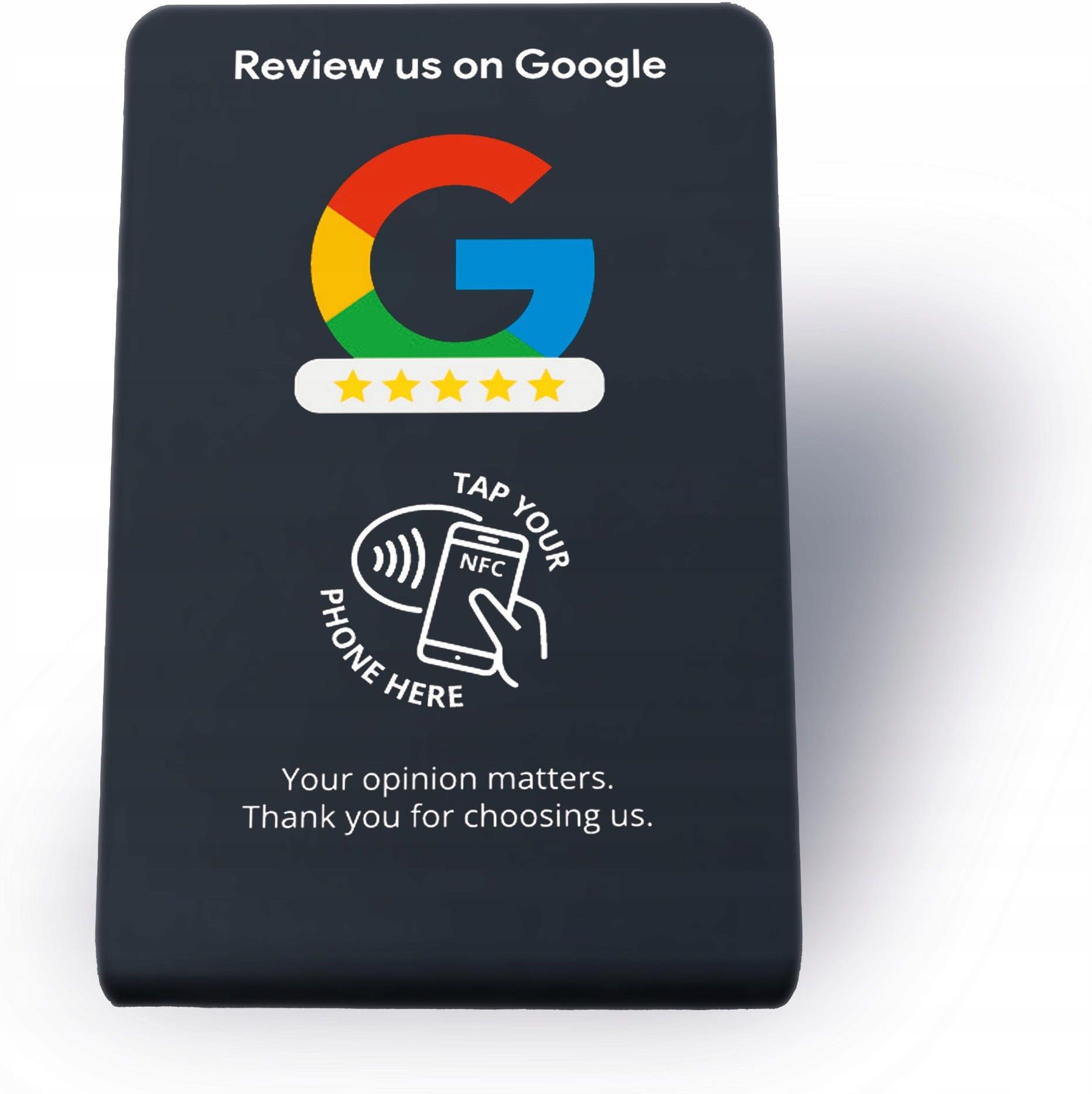 Zbieranie opinii Google nie musi być niewygodne ani krępujące dla klienta. Większość firm ma ten sam problem - klienci są zadowoleni, ale nie wystawiają opinii, bo trzeba coś wpisać, zeskanować albo zapamiętać na później. Ten stand NFC rozwiązuje ten problem w najprostszy możliwy sposób: klient przykłada telefon i od razu trafia do opinii Google, dokładnie w tym momencie, w którym pozytywne wrażenie jest jeszcze świeże. Ten stand NFC zamienia moment obsługi klienta w realną szansę na nową opinię Google. Dzięki technologii NFC proces jest szybki, naturalny i nie wymaga żadnych instrukcji ani tłumaczeń. Klient nie musi instalować aplikacji, skanować kodów QR ani wpisywać adresów – wszystko dzieje się automatycznie po zbliżeniu telefonu do standu. Elegancki wygląd standu wzmacnia profesjonalny wizerunek Twojej firmy. Minimalistyczna forma i czarny kolor sprawiają, że stand dobrze prezentuje się na ladzie, recepcji czy stoliku. Napisy w języku angielskim („Review us on Google”, „Tap your phone here”) są czytelne i uniwersalne, co czyni ten wariant idealnym również dla miejsc obsługujących klientów zagranicznych. Obsługa standu jest intuicyjna nawet dla osób, które nie są techniczne. Wbudowany tag NFC automatycznie otwiera formularz opinii Google na telefonach z systemem Android i iOS obsługujących NFC. Klient wykonuje jeden prosty gest, a cały proces zajmuje zaledwie kilka sekund, bez angażowania personelu i bez przerywania obsługi. Specyfikacja techniczna standu została dopasowana do codziennego użytkowania w punktach stacjonarnych. technologia: NFC kolor: czarny materiał: tworzywo sztuczne forma: stojący stand kompatybilność: Android i iOS (urządzenia z NFC) przeznaczenie: zbieranie opinii Google Stand NFC sprawdzi się w wielu branżach, gdzie opinia klienta ma realne znaczenie. Rozwiązanie jest idealne dla restauracji, kawiarni i barów, a także hoteli, apartamentów i pensjonatów. Dobrze sprawdzi się w salonach fryzjerskich i kosmetycznych, gabinetach medycznych oraz fizjoterapeutycznych, biurach obsługi klienta, recepcjach, sklepach stacjonarnych i innych punktach usługowych. Produkt jest gotowy do użycia od razu po otrzymaniu i nie generuje dodatkowych kosztów. Stand posiada zaprogramowany tag NFC, nie wymaga zasilania ani baterii i może być używany przez długi czas. Do wystawienia opinii wymagane jest jedynie zalogowanie się na konto Google.