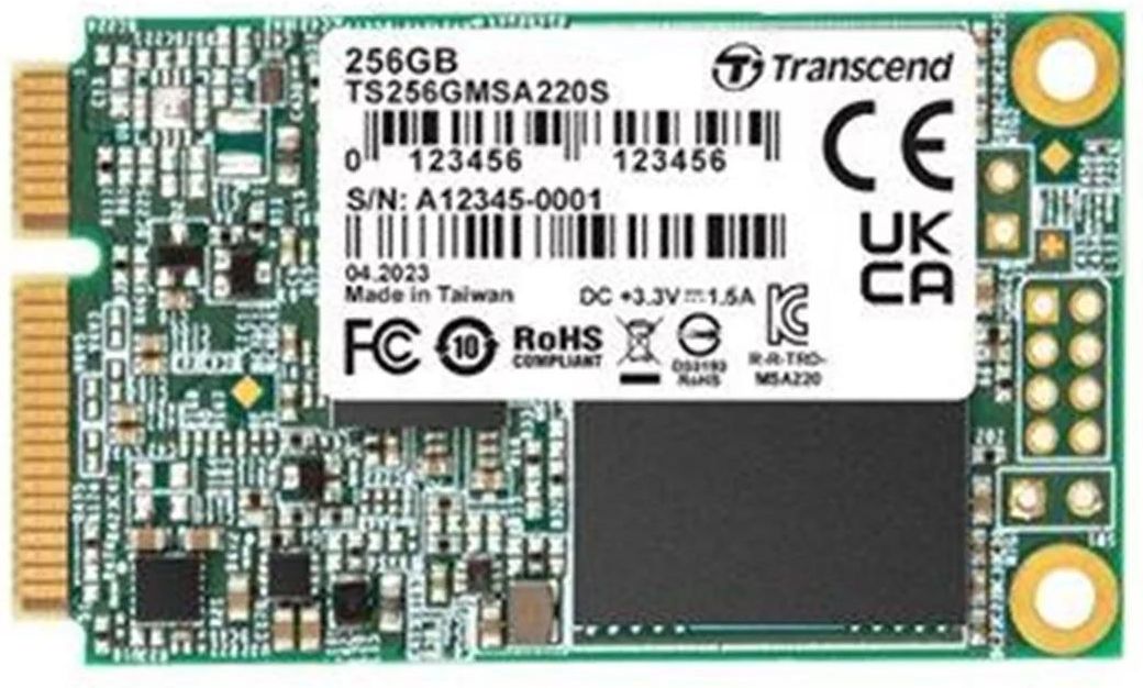 Transcend 220S mSATA 256 GB Serial ATA III 3D NAND Transcend 220S. Pojemność pamięci SSD: 256 GB, Rozmiar kieszeni dysku SSD: mSATA, Prędkość odczytu z nośnika: 560 MB/s, Prędkość zapisu nośnika: 500 MB/s, Szybkość przesyłania danych: 6 Gbit/s, Przeznaczenie: PC/Laptop Najważniejsze parametry techniczne Nośnik danych - Pojemność pamięci SSD: 256 GB Nośnik danych - Rozmiar kieszeni dysku SSD: mSATA Porty i interfejsy - Standardowe rozwiązania komunikacyjne: Serial ATA III Wydajność - Szybkość przesyłania danych: 6 Gbit/s Wydajność - Obsługiwane systemy operacyjne Windows: Tak Szanse na przetrwanie - Zgodność z zasadami zrównoważonego rozwoju: Tak Szczegóły Techniczne - Certyfikat środowiskowy (zrównoważonego rozwoju): BSMI, CE, Federalna Komisja Łączności (FCC), KC, UKCA Cechy - Przeznaczenie: PC/Laptop Cechy - Korekcja ECC: Tak Cechy - Typ pamięci: 3D NAND Cechy - Prędkość odczytu z nośnika: 560 MB/s Cechy - Prędkość zapisu nośnika: 500 MB/s Cechy - Losowy odczyt (4KB): 60000 IOPS Cechy - Losowy zapis (4KB): 83000 IOPS Cechy - Obsługa S.M.A.R.T.: Tak Cechy - Wsparcie TRIM: Tak Cechy - MTBF (Średni okres międzyawaryjny): 2000000 h Cechy - Kolejkowaniem zadań (NCQ): Tak Cechy - Współczynnik TBW: 83 Warunki pracy - Zakres temperatur (eksploatacja): 0 - 70 °C Wymagania systemowe - Obsługiwany systemy operacyjne Linux: Tak Moc - Napięcie pracy: 3,3 V Waga i rozmiary - Waga produktu: 8 g Waga i rozmiary - Szerokość produktu: 29,9 mm Waga i rozmiary - Głębokość produktu: 50,8 mm Waga i rozmiary - Wysokość produktu: 4,85 mm Klasyfikacja - Kod producenta: TS256GMSA220S Klasyfikacja - EAN: 0760557862406 Klasyfikacja - ID Produktu: 111738184