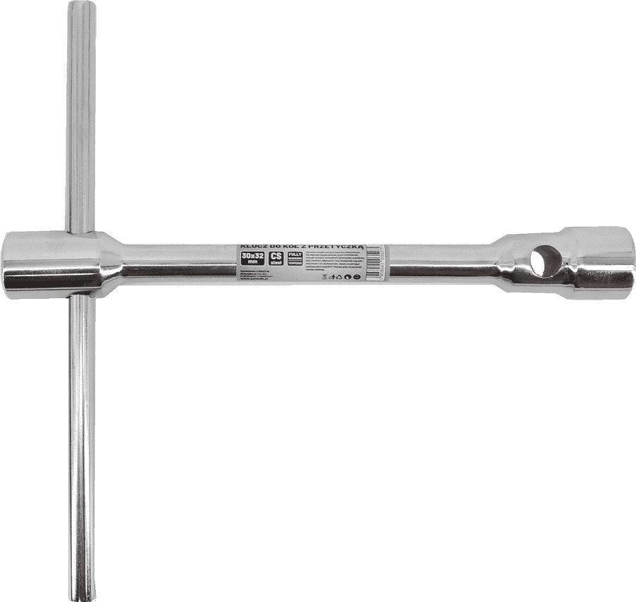 Dwustronny klucz do kół wykonany z wysokiej jakości odkuwki ze stali węglowej, ocynkowany dla ochrony przed korozją, z gniazdem sześciokątnym i przewierconym otworem przelotowym dla wysuwanej przetyczki. Kuty matrycowo, hartowany i chromowany. Przeznaczony do poluzowywania lub dokręcania śrub i nakrętek na wąskich powierzchniach i we wnękach, często używany do napraw samochodów i maszyn. Dane techniczne: Materiał: stal narzędziowa węglowa (CS) Rozmiar: 24x27mm, 1xprzetyczka Waga: 3.020kg