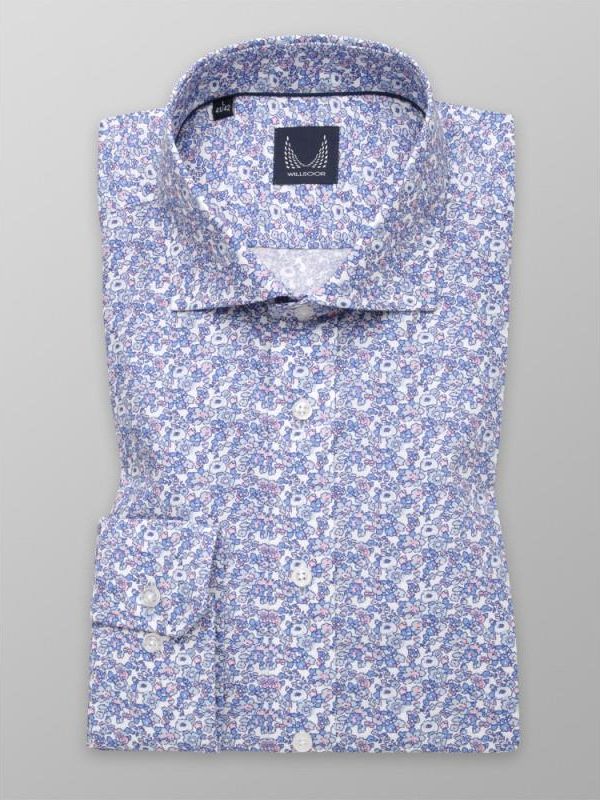 Biała taliowana koszula w drobne niebieskie kwiatki z włoskim kołnierzykiem