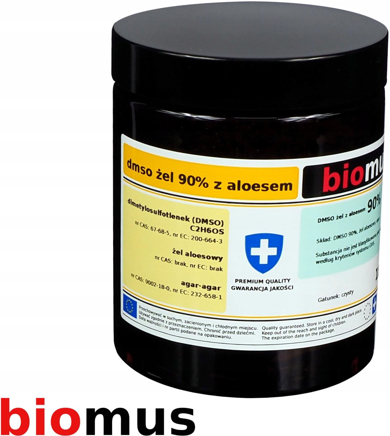 DMSO ŻEL 90% Z ALOESEM Dimetylosulfotlenek Aloes BIOMUS 180ml Bardzo Mocny DMSO ŻEL 90% Z ALOESEM Dimetylosulfotlenek Aloes BIOMUS 180ml Bardzo Mocny Dmso Żel 90% to wyjątkowy produkt, który łączy w sobie moc dimetylosulfotlenku (DMSO) oraz czystość aloesu na poziomie 99%. Dmso Żel z Aloesem 90% to idealne rozwiązanie. Krystalicznie czysty żel jest łatwy w aplikacji, co czyni go wygodnym w codziennym użytkowaniu. Korzyści ✔️ Naturalna siła i czystość ✔️ Wsparcie produkcji kolagenu ✔️ Wszechstronne zastosowanie ✔️ Wygodna forma żelu ✔️ Mocno skoncentrowany ✔️ Wydajny ✔️ Wyprodukowany w Polsce z użyciem zielonej energii ✔️ Opakowanie z ciemnego szkła DMSO ŻEL 90% z aloesem BIOMUS 180ml Skład: DMSO (czystość min. 99,9%) 90%, żel aloesowy, agar (naturalna substancja żelująca) Substancja nie jest klasyfikowana jako niebezpieczna według kryteriów systemu GHS. DMSO ŻEL 90% z aloesem BIOMUS 180ml ✔️ Gwarantujemy produkty wyłącznie najwyższej czystości i jakości. ✔️ Produkt wysokiej czystości - bez domieszek i wypełniaczy. ✔️ Produkt posiada atest - świadectwo kontroli polskiego laboratorium. ✔️ Produkt przebadany pod względem jakości i zawartości. ✔️ Produkt zgodny z polskimi i europejskimi normami jakości. ✔️ Produkt dopuszczony do obrotu na terenie całej Unii Europejskiej. ✔️ Produkt posiada kartę charakterystyki produktu tzw. MSDS. ✔️ Produkt przeznaczony do zastosowań profesjonalnych. ✔️ Produkt oznaczony jest zgodnie z europejskimi normami bezpieczeństwa CLP, REACH. Dimetylosulfotlenek (DMSO) C2H6OS ✔️ nr CAS: 67-68-5, nr EC: 200-664-3 ✔️ Nr index: nie dotyczy ✔️ Synonimy: DMSO, dimetylu sulfotlenek, dimethyl sulfoxide, metylosulfotlenek, metylosulfinylometan, ✔️ Gatunek: Czysty ✔️ Czystość: Czysty min. 99,9% ✔️ Zapach: charakterystyczny ✔️ Kolor: bezbarwny, klarowny Żel aloesowy nr CAS: brak, nr EC: brak Agar-agar nr CAS: 9002-18-0, nr EC: 232-658-1