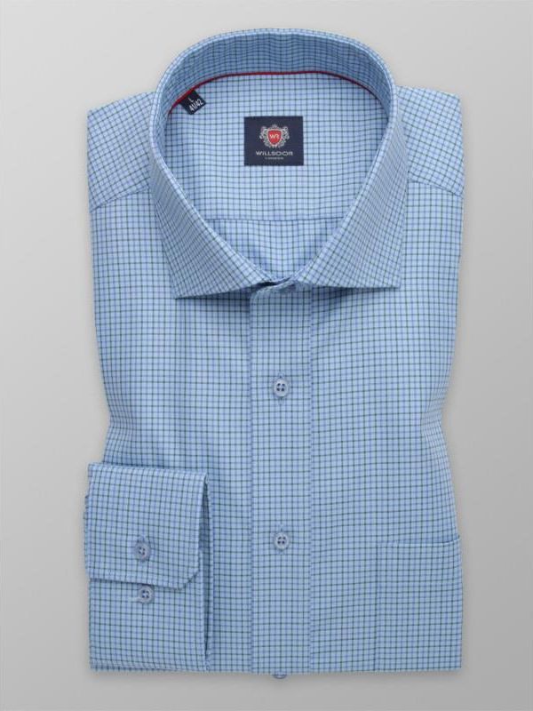Błękitna taliowana koszula w drobną zieloną i niebieską kratkę z włoskim kołnierzykiem, splot two-ply