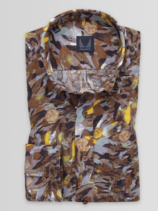 Brązowa klasyczna koszula w liście i kwiaty z podpinanym kołnierzykiem, tkanina z dodatkiem wiskozy