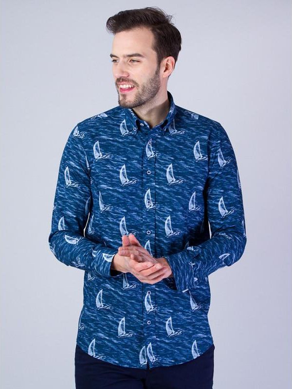 Granatowa taliowana koszula w fale i żaglówki z podpinanym kołnierzykiem