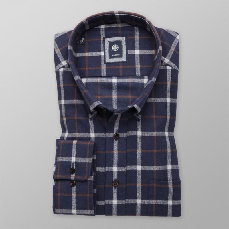 Klasyczna granatowa koszula w białą i brązową kratę z podpinanym kołnierzykiem, tkanina flanelowa ze splotem two-ply