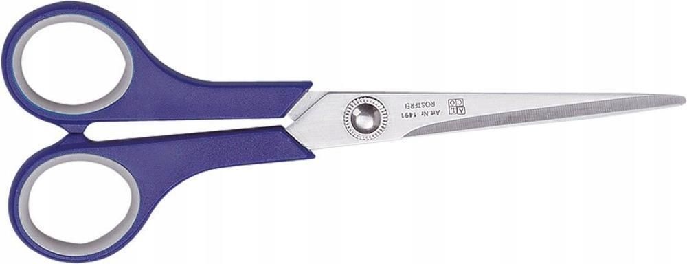 Wysokiej jakości nożyczki, ergonomicznie ukształtowane uchwyty wykonane z nietłukącego niebieskiego tworzywa sztucznego z szarymi gumowanymi wstawkami, ostrza są połączone metalową śrubą. Długość nożyczek 17cm, długość ostrza 8,5cm.