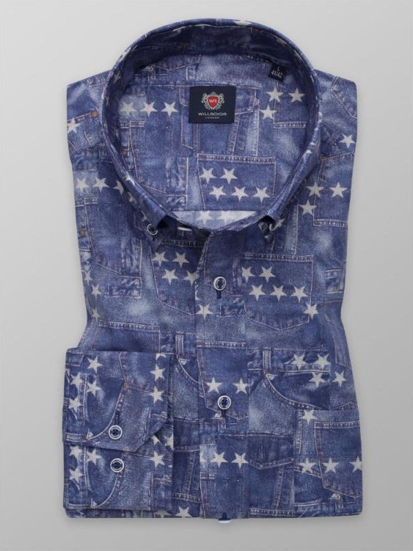 Niebieska klasyczna koszula typu denim w gwiazdki z podpinanym kołnierzykiem, formuła Stretch