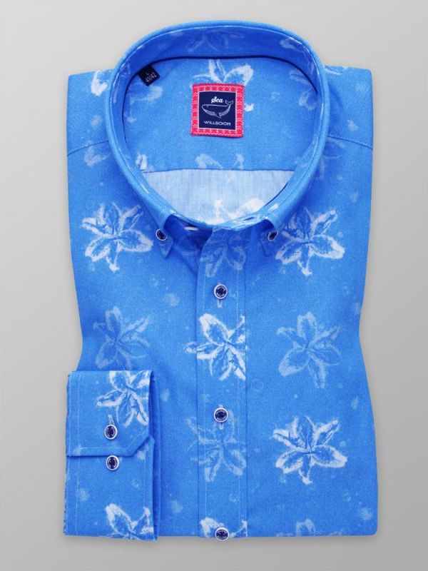 Niebieska taliowana koszula w duże białe kwiaty z podpinanym kołnierzykiem i granatowymi guzikami