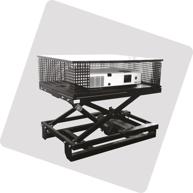 Winda stołowa / meblowa RAVELL® do projektora multimedialnego stanowi doskonałą alternatywę dla wind sufitowych. Umożliwia zainstalowanie projektora multimedialnego w meblu lub podłodze. Urządzenie bardzo chętnie wykorzystywane jest przez architektów w aranżacjach domowych oraz w instytucjach użyteczności publicznej. ZASTOSOWANIE w wersji STANDARD - maksymalny zasięg 660 mm max udźwig - 15kg (wraz z płytą wysłaniającą) AKCESORIA DODATKOWE dystansowniki montażowe o wymaganej długości, sterowanie bezprzewodowe IR, RF oraz RS232 maskownica projektora. GŁÓWNE CECHY konstrukcja windy oparta na systemie trzech ram poziomych prowadzonych przez precyzyjny wysięgnik nożycowy, ruch w górę i w dół wywoływany przez siłownik liniowy sterowany przez centralkę komputerową stuprocentowa powtarzalność, cichy, płynnie działający mechanizm prosta obsługa, pewna i funkcjonalna konstrukcja wykonana z wysokiej jakości komponentów, wykończenie lakierem proszkowym w kolorze: czarnym, białym, srebrnym (na zamówienie możliwość wyboru innej kolorystyki z palety RAL), estetyczne i precyzyjne wykonanie.