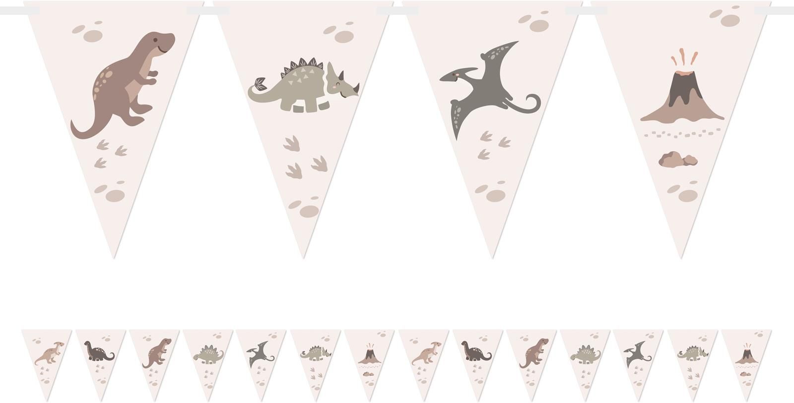 Papierowy baner jednostronny flagi z nadrukiem dinozaurów. Pasuje do zestawu Dinusie. Idealny dodatek na urodziny czy piknik. Odległości pomiędzy flagami można samodzielnie zmieniać. Długość tasiemki: 500 cm. Wymiar flagi: 15 cm. Ilość flag: 14 szt.