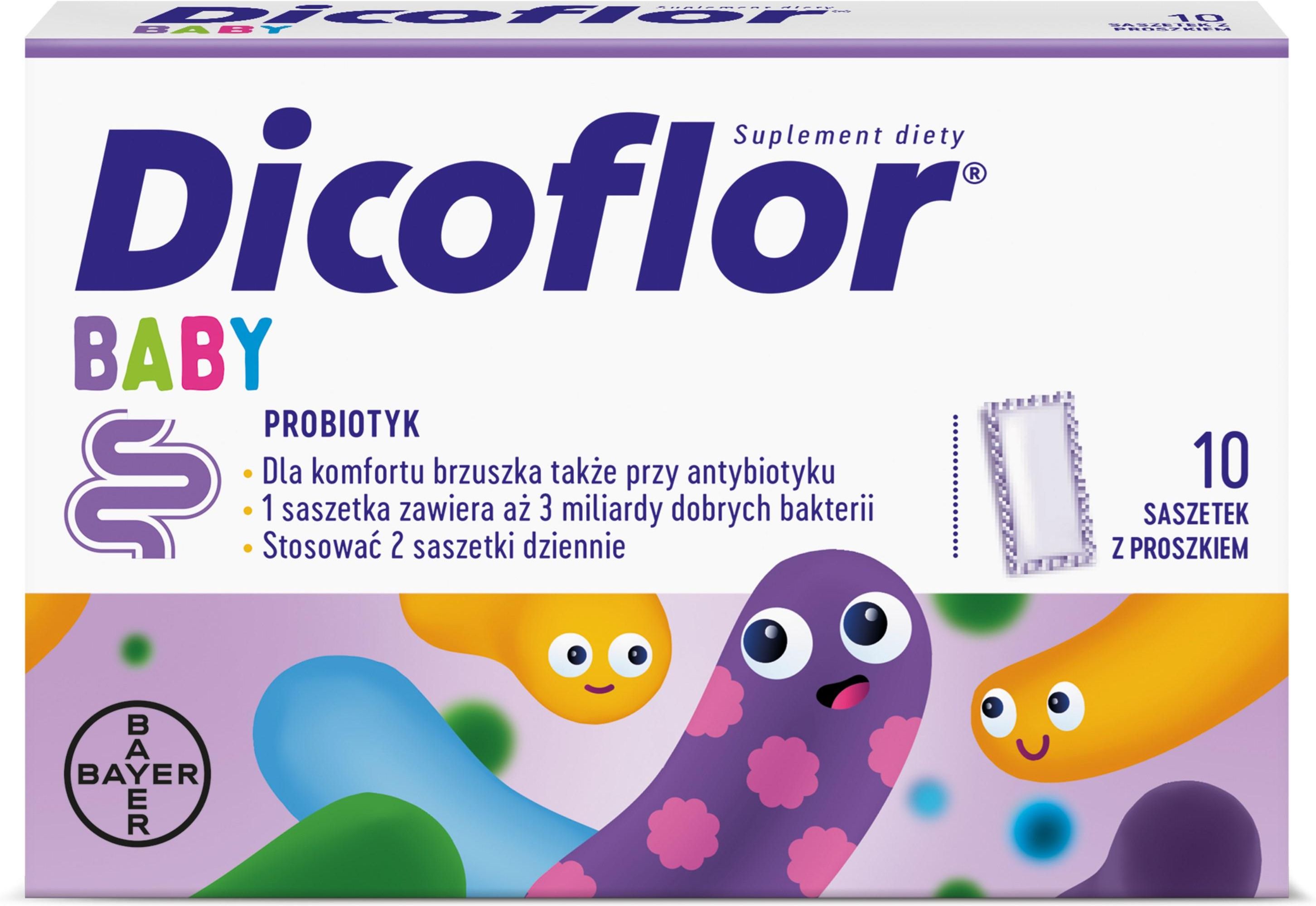 Charakterystyka Dicoflor Baby to suplement diety w postaci proszku w saszetkach, przeznaczony dla niemowląt i dzieci. Zawiera żywe kultury bakterii Lactobacillus rhamnosus GG (ATCC 53103) – jeden z najlepiej przebadanych szczepów probiotycznych, który naturalnie zasiedla przewód pokarmowy człowieka. Preparat wspiera równowagę mikroflory jelitowej, szczególnie w okresach jej zaburzenia, takich jak antybiotykoterapia, infekcje, zmiany diety czy stres. Prawidłowa mikroflora jelitowa odgrywa istotną rolę w funkcjonowaniu układu odpornościowego, trawieniu i wchłanianiu składników odżywczych. Forma saszetek umożliwia wygodne podanie – zawartość można rozpuścić w wodzie, mleku lub dodać do pokarmu o temperaturze pokojowej. Produkt nie zawiera glutenu, laktozy ani białka mleka krowiego, dzięki czemu jest odpowiedni dla dzieci z nietolerancjami pokarmowymi. Skład Lactobacillus rhamnosus GG (ATCC 53103) – 1 × 10⁹ CFU w 1 saszetce Maltodekstryna Dawkowanie Zalecana porcja do spożycia: Niemowlęta i dzieci: 1 saszetka dziennie Zawartość saszetki należy rozpuścić w niewielkiej ilości płynu o temperaturze pokojowej (np. w wodzie, mleku, soku) i podać bezpośrednio po przygotowaniu. Nie należy przekraczać zalecanej porcji do spożycia w ciągu dnia. Przeciwwskazania Nadwrażliwość na którykolwiek ze składników produktu. Ostrzeżenia i środki ostrożności Suplement diety nie może być stosowany jako substytut zróżnicowanej diety. Produkt przeznaczony dla niemowląt i dzieci. W przypadku wcześniaków, dzieci z obniżoną odpornością lub chorobami przewlekłymi – stosowanie należy skonsultować z lekarzem. Wartości odżywczeDziałania niepożądane Produkt jest dobrze tolerowany. W rzadkich przypadkach mogą wystąpić łagodne dolegliwości żołądkowo-jelitowe. W razie wystąpienia objawów niepożądanych należy przerwać stosowanie i skonsultować się z lekarzem. Przechowywanie Przechowywać w temperaturze poniżej 25°C, w suchym miejscu, z dala od światła. Chronić przed dziećmi. Producent Bayer Sp. z o.o. Al. Jerozolimskie 158 02-326 Warszawa