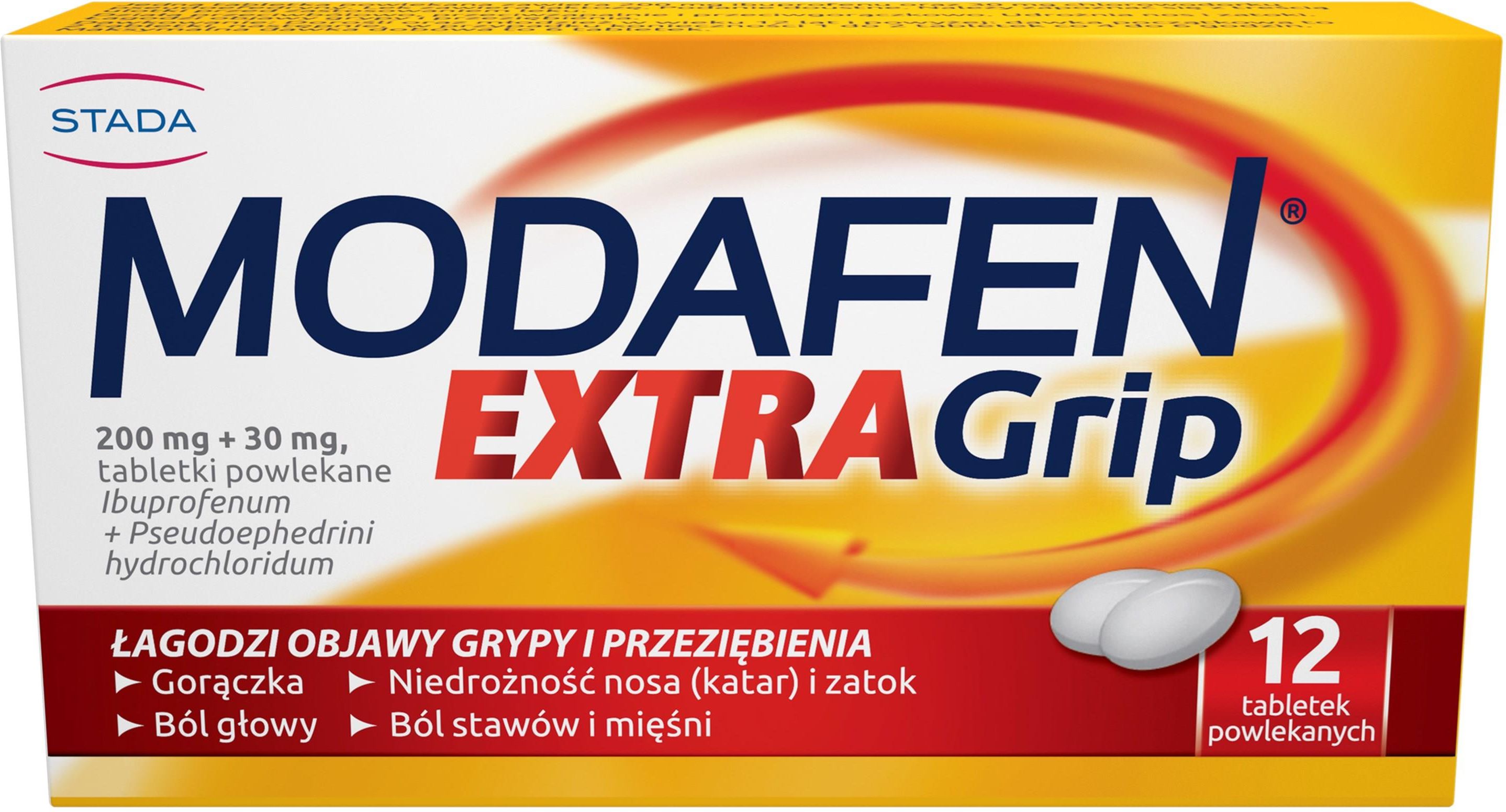 MODAFEN to lek przeciwgorączkowy, przeciwbólowy oraz zmniejszający przekrwienie błony śluzowej nosa. Preparat stosuje się doraźnie w celu złagodzenia objawów grypy i przeziębienia takich, jak: gorączka, ból głowy, niedrożność nosa i zatok obocznych nosa, bóle stawowo-mięśniowe. Działanie Preparat Modafen jest preparatem złożonym zawierającym dwie substancje czynne: ibuprofen i pseudoefedrynę. Ibuprofen hamuje wytwarzanie prostaglandyn, które są uwalniane w miejscu uszkodzenia tkanek i powodują ból i odczyn zapalny. Ibuprofen działa przeciwgorączkowo. Pseudoefedryna zmniejsza przekrwienie i obrzęk błon śluzowych. W ten sposób ułatwia oddychanie przez nos oraz powoduje wyrównanie ciśnienia w uchu środkowym. Wskazania -krótkotrwałe leczenie objawów nieżytu nosa -leczenie ostrego zapalenia nosogardzieli -leczenie ostrego zapalenia gardła -leczenie ostrego nieżytu trąbki słuchowej. Przyjmowanie Tabletki należy połykać w całości (bez rozgryzania) popijając odpowiednią ilością wody. Dorośli i dzieci powyżej 12 roku życia: 1 tabletka 3 razy dziennie w cięższych przypadkach lub w okresach zaostrzenia objawów można zastosować 2 tabletki 3 razy dziennie. Maksymalna dawka dobowa wynosi 6 tabletek. W trakcie leczenie nie należy spożywać alkoholu. Nie stosować u dzieci poniżej 12 roku życia. Działanie niepożądane Ibuprofen może powodować dolegliwości ze strony przewodu pokarmowego: nudności, wymioty, bóle w nadbrzuszu, zgagę, biegunkę lub zaparcia, wzdęcia. Rzadko mogą powstawać wrzody żołądka lub dwunastnicy, krwawienie z przewodu pokarmowego, zapalenie żołądka, zaburzenia czynności wątroby, zapalenie trzustki. Ze strony ośrodkowego układu nerwowego mogą wystąpić: ból i zawroty głowy, rzadko bezsenność, depresja, chwiejność emocjonalna. U pacjentów z astmą preparat może indukować skurcz oskrzeli. Pseudoefedryna może powodować zaburzenia ze strony przewodu pokarmowego, nadmierną potliwość, nadmierne pragnienie, częstoskurcz, ból zamostkowy, niepokój i bezsenność. Rzadziej zaburzenia oddawania moczu, osłabienie napięcia mięśni, drżenia, omamy. Lek może wpływać na zdolność prowadzenia pojazdów i obsługi urządzeń mechanicznych. Przeciwwskazania Preparat Modafen jest przeciwwskazany u pacjentów ze znaną nadwrażliwością na którykolwiek ze składników preparatu, a także na kwas acetylosalicylowy i inne niesteroidowe leki przeciwzapalne, z objawami astmy, pokrzywki itp. Preparatu Modafen nie należy stosować w przypadku: czynnej choroby wrzodowej żołądka i dwunastnicy, nadciśnienia tętniczego, choroby niedokrwiennej serca, częstoskurczu serca, cukrzycy, nadczynności tarczycy, guza chromochłonnego nadnerczy, przerostu gruczołu krokowego i jaskry z zamkniętym kątem. Nie zaleca się stosowania preparatu Modafen w okresie ciąży i w okresie karmienia piersią. U wrażliwych pacjentów lek może wywołać zawroty głowy i wpływać na czynność ośrodkowego układu nerwowego. Lek może też niekorzystnie wpływać na wykonywanie czynności powodujących konieczność zwiększonej uwagi, koordynacji ruchów i szybkiego podejmowania decyzji (np. prowadzenie pojazdów, obsługiwanie maszyn, praca na wysokościach itp.). Składniki 1 tabletka zawiera: -ibuprofen 200mg -chlorowodorek pseudoefedryny 30mg