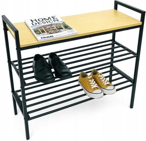 Elegancki i praktyczny stojak na buty — porządek w przedpokoju w stylu vintage Szukasz prostego, a jednocześnie efektownego sposobu na przechowywanie obuwia? Mebel, który pasuje do wnętrz w stylu loftowym, industrialnym i rustykalnym. To rozwiązanie dla osób ceniących porządek, funkcjonalność i styl. Dlaczego warto wybrać ten stojak? Praktyczny układ 3 półek — pomieści do 12 par butów, dzięki czemu łatwo utrzymasz porządek w przedpokoju. Solidna konstrukcja — stalowa rama malowana proszkowo zapewnia stabilność i trwałość na lata. Estetyka — laminowana płyta nadaje naturalny charakter, pasujący do wielu aranżacji. Lekki i łatwy w montażu — prosty montaż i łatwe utrzymanie w czystości sprawiają, że mebel jest bardzo użytkowy. Dane techniczne Materiał: stal malowana proszkowo + płyta laminowana. Kolor: czarny mat (rama) + naturalny odcień drewna (płyta). Liczba poziomów: 3 Maksymalna liczba par butów: do 12 par. Maksymalne równomierne obciążenie: 40 kg. Wymiary: wysokość 65 cm × szerokość 80 cm × głębokość 30 cm; grubość płyty 12 mm. Waga produktu: 5,70 kg. Uwaga: brak możliwości siadania na regale. Korzyści dla klienta Zyskujesz schludny i spójny wizualnie przedpokój bez konieczności rezygnacji ze stylu. Idealny do mieszkań, domów i biur — świetnie komponuje się z meblami w stylu loft lub vintage. Funkcjonalność przy jednoczesnym oszczędzeniu miejsca — szerokość 80 cm i głębokość 30 cm to praktyczne wymiary do wąskich korytarzy. Porady praktyczne Ustaw regał przy ścianie, aby zapewnić maksymalną stabilność. Regularne przecieranie wilgotną ściereczką pozwoli zachować estetyczny wygląd płyty laminowanej. Jeśli planujesz przechowywać cięższe buty zimowe, rozłóż obciążenie równomiernie między półkami (max 40 kg). Dla kogo? Dla par, singli i rodzin, które potrzebują funkcjonalnego rozwiązania do przechowywania butów — szczególnie polecany do mieszkań w stylu industrialnym, loftowym i rustykalnym. Call to Action Zadbaj o porządek już dziś — dodaj stojak do koszyka i odśwież wygląd przedpokoju prostym krokiem!