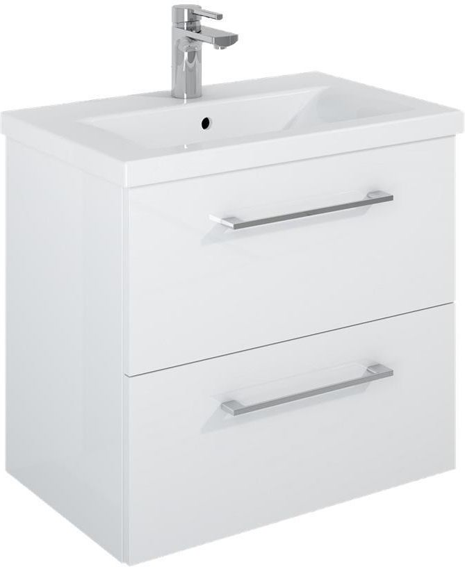 Szafka łazienkowa z umywalką 60 wisząca Cheese W skład zestawu wchodzą: umywalka 60 szafka pod umywalkę Zestaw łazienkowy Cheese 60 składa się z szafki oraz umywalki w kolorze białym. Biały kolor oraz chromowane uchwyty zapewniają stylowy design i elegancki charakter każdej łazience. Informacje o produkcie: Boki oraz front szafki lakierowane są na wysoki połysk, co dodaje meblom estetyki, a jednocześnie sprawia, że są wyjątkowo łatwe w utrzymaniu w czystości. Dodatkowo mebel wyposażony został w system cichego domykania szuflad. Bateria umywalkowa prezentowana na zdjęciu nie jest częścią zestawu. Szafka jest w postaci skręconego mebla gotowego do powieszenia. Parametry: Wykonanie: Lakierowane Kolor frontu: Biały Kolor korpusu: Biały System samodomykania: Tak Seria: Cheese Waga: 30,2 kg Wysokość: 56,7 cm Szerokość: 61,7 cm Głębokość / Grubość: 39,7 cm Liczba szuflad: 2 Przykładowa aranżacja: