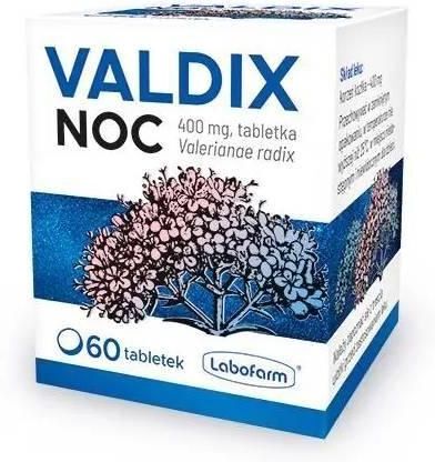 Laboratorium Farmaceutyczne Labofarm Sp. z o.o. Sp. k. ul. Lubichowska 176 b 83-200 Starogard Gdański Lek należy przechowywać w oryginalnym opakowaniu, w temperaturze do 25°C, w miejscu niewidocznym i niedostępnym dla dzieci. Lek Valdix Noc jak każdy inny lek może powodować działania niepożądane, chociaż nie u każdego one wystąpią. Częstość nieznana (nie może być określona na podstawie dostępnych danych): dolegliwości żołądkowo-jelitowe, np. nudności, skurcze brzucha. Przed użyciem zapoznaj się z ulotką, która zawiera wskazania, przeciwwskazania, dane dotyczące działań niepożądanych, dawkowanie oraz informacje dotyczące stosowania produktu leczniczego bądź skonsultuj się z lekarzem lub farmaceutą, gdyż każdy lek niewłaściwie stosowany zagraża Twojemu życiu lub zdrowiu. 1 tabletka leku zawiera: Substancję czynną: korzeń kozłka (Valerianae radix) 400 mg. Jedna tabletka zawiera nie mniej niż 0,32 mg kwasów walerenowych. Ciąża i karmienie piersią Jeżeli pacjentka jest w ciąży lub karmi piersią, przypuszcza, że może być w ciąży lub gdy planuje mieć dziecko, powinna poradzić się lekarza lub farmaceuty przed zastosowaniem tego leku. Ze względu na brak danych potwierdzających bezpieczeństwo stosowania leku w okresie ciąży i karmienia piersią, nie zaleca się stosowania leku. Prowadzenie pojazdów i obsługiwanie maszyn Z uwagi na zwiększanie skłonności do zasypiania nie zaleca się stosowania leku przez osoby kierujące pojazdami w godzinach nocnych i osoby odczuwające zmęczenie. Nie zaleca się prowadzenia pojazdów i obsługiwania maszyn do dwóch godzin po przyjęciu leku. Jednorazowe przyjęcie korzenia kozłka w ilości około 20 g powodowało łagodne objawy: zmęczenie, skurcze w nadbrzuszu, uczucie ucisku w klatce piersiowej, zawroty głowy, drżenie rąk, rozszerzenie źrenic, które ustępowały po 24 godzinach. Uspokajające, wyciszające, ułatwiające zasypianie. Valdix Noc jest lekiem roślinnym o działaniu uspokajającym oraz ułatwiającym zasypianie. Substancją czynną leku jest suchy wyciąg z korzenia kozłka lekarskiego (Valerianae radix), a wskazaniem do stosowania preparatu są łagodne stany napięcia nerwowego i niepokoju oraz trudności w zasypianiu. Młodzież powyżej 12 lat, dorośli, osoby w wieku podeszłym: W łagodnych objawach napięcia nerwowego od 1 do 2 tabletek do 3 razy dziennie. W trudnościach w zasypianiu od 1 do 2 tabletek pół godziny do godziny przed snem lub, jeśli konieczne, dodatkowo od 1 do 2 tabletek wieczorem. Droga podania: doustna. Łagodne stany napięcia nerwowego i niepokoju. Trudności w zasypianiu. Należy powiedzieć lekarzowi lub farmaceucie o wszystkich lekach przyjmowanych przez pacjenta obecnie, lub ostatnio, a także o lekach, które pacjent planuje przyjmować, w szczególności: syntetyczne leki uspokajające takie jak barbiturany, leki nasenne z grupy benzodiazepin, leki nasenne. Nie zaleca się jednoczesnego stosowania syntetycznych leków uspokajających z lekiem Valdix Noc ze względu na podobny mechanizm działania. Jeśli pacjent nie jest pewien, czy przyjmuje którykolwiek z wyżej wymienionych leków, powinien skontaktować się z lekarzem lub farmaceutą. Uczulenie na wyciąg z korzenia kozłka lub którykolwiek z pozostałych składników leku oraz jeżeli pacjent źle toleruje przetwory zawierające korzeń kozłka (walerianę). Nie stosować u dzieci w wieku poniżej 12 lat.