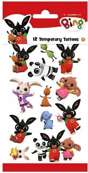 PRODUKT TATUAŻE ZMYWALNE BING Wspaniały zestaw tatuaży zmywalnych, który zadowoli każdego małego fana BINGA Ciekawe, kolory i niebanalna grafika mogą sprawić, że robienie tatuaży będzie głównym punktem zabawy. Zestaw zawiera 12 szt. tatuaży zmywalnych Tatuaż wystarczy zwilżyć wodą i po 30 s jest gotowy!
