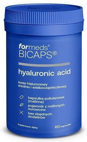 ForMeds BICAPS HYALURONIC ACID Skóra Stawy BICAPS® HYALURONIC ACID ForMeds 60 kapsułek Suplement diety Zalety Przyczynia się do utrzymania zdrowego wyglądu skóry, Pomaga w utrzymaniu zdrowych stawów, Pomaga w utrzymaniu zdrowych oczu. Opis Suplement diety BICAPS® HYALURONIC ACID zawiera 200 mg kwasu hialuronowego w 1 kapsułce bez żadnych dodatków. Produkt odpowiedni dla wegetarian i wegan. Kwas hialuronowy: to polimer występujący we wszystkich organizmach żywych. Niestety z wiekiem jego ilość maleje, co skutkuje między innymi starzeniem się skóry. Jako substancja fizjologiczna, czyli bezpieczna dla organizmu, z dużą możliwością wiązania wody stosowany jest w profilaktyce i terapii w wielu dziedzinach medycyny – medycynie estetycznej, ortopedii, okulistyce czy ginekologii. KH w największej ilości występuje w organizmie ludzkim w tkance łącznej, między innymi w macierzy zewnątrzkomórkowej, w skórze i naskórku, chrząstce, maziówce stawów, ścianie naczyń, ciele szklistym oka oraz krążkach międzykręgowych kręgosłupa. KH izolowany jest z różnych części organizmów zwierzęcych: gałek ocznych kręgowców, skóry rekina, pępowiny, a największą jego zawartość znajduje się w grzebieniach kogucich. Anionowa budowa kwasu umożliwia wiązanie dużych ilości wody. Cząsteczki kwasu hialuronowego to jedne z najbardziej hydrofilowych cząsteczek występujących przyrodzie (każda cząsteczka może związać 250 cząsteczek wody). Z wiekiem zawartość kwasu w skórze znacząco obniża się, co wraz ze zmianami zachodzącymi we włóknach sprężystych i kolagenowych powoduje odwodnienie, spadek elastyczności i zaniki skóry, co klinicznie przejawia się suchością skóry, występowaniem zmarszczek i bruzd. Naturalna kapsułka z pullulanu Pullulan jest otrzymywany w naturalnym procesie fermentacji. Podczas produkcji nie stosuje się surowców pochodzenia zwierzęcego, dlatego kapsułka jest odpowiednia dla wegetarian i wegan. Przejrzysty skład Produkty nie zawierają sztucznych wypełniaczy, przeciwzbrylaczy i barwników, takich jak: stearynian magnezu, dwutlenek krzemu, dwutlenek tytanu itp. Pojemnik z roślinnych surowców Pojemnik wykonany jest z roślinnych i odnawialnych surowców nie GMO. Etykieta jest w pełni biodegradowalna i nadaje się do kompostowania. _____________________________________________________ Porcja dzienna- 1 kapsułka zawiera Kwas hialuronowy - 200 mg _____________________________________________________ Informacje ogólne Składniki: Kwas hialuronowy, pullulan (otoczka kapsułki). Dzienne spożycie: 1 kapsułka w trakcie posiłku Zawartość: 60 kapsułek Nie należy przekraczać zalecanej dziennej porcji do spożycia w ciągu dnia. Produkt nie może być stosowany przez kobiety w ciąży, karmiące i dzieci bez konsultacji lekarskiej. Produkt nie może być stosowany jako substytut zróżnicowanej diety. Nie stosować w przypadku uczulenia na którykolwiek ze składników.Zalecamy zrównoważony sposób żywienia i zdrowy tryb życia. Przechowywanie: Przechowywać w miejscu chłodnym i suchym. Ten produkt można przechowywać w temperaturze pokojowej. Dla zachowania świeżości może być przechowywany w lodówce. Przechowywać w miejscu niedostępnym dla dzieci. Ostrzeżenie: Kobiety w ciąży, karmiące powinny skonsultować się z lekarzem. Producent : ForMeds Sp. z o.o. INFORMACJE O PRODUCENCIE Firma ForMeds od samego początku specjalizuje się w produkcji suplementów diety bez chemicznych dodatków. Priorytetem firmy ForMeds jest oferowanie naturalnych, skutecznych oraz bezpiecznych wyrobów. Opracowywanie nowej receptury i każdy etap testowania podlega ścisłej kontroli. Cały proces produkcji zgodny jest z procedurami HACCP i wszystkie jego etapy są udokumentowane. Szczegółowe badania produktów gotowych są prowadzone przez certyfikowane i niezależne laboratoria. Składnikami suplementów diety są surowce o najwyższej jakości pozyskiwane od renomowanych europejskich dostawców. Wszystkie produkty firmy ForMeds znajdują się w Rejestrze Głównego Inspektoratu Sanitarnego oraz w Bazie Leków i Środków Ochrony Zdrowia KS- BLOZ.