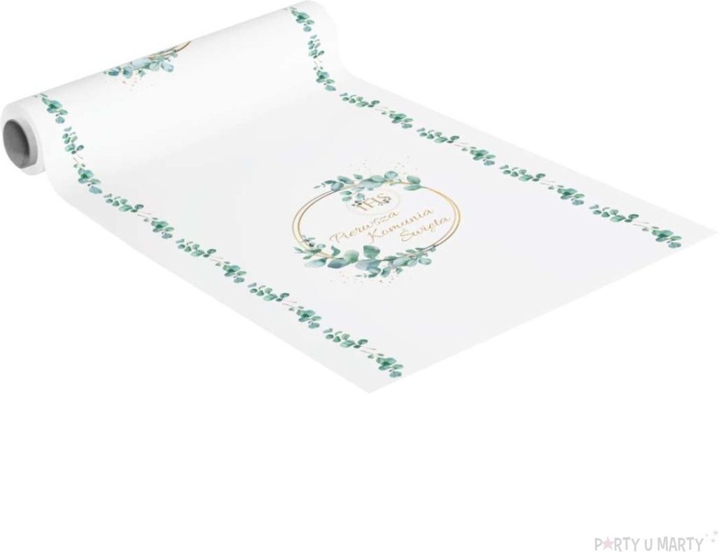Oryginalny dodatek do dekoracji stołu w postaci papierowego bieżnika w białym kolorze ze wzorem liści eukaliptusa i złotym napisem Pierwsza Komunia Święta w okręgu. Znajduje się na nim również kielich z hostią IHS. Dzięki nim cała aranżacja komunijna w prosty sposób nabierze elegancji, a sam …