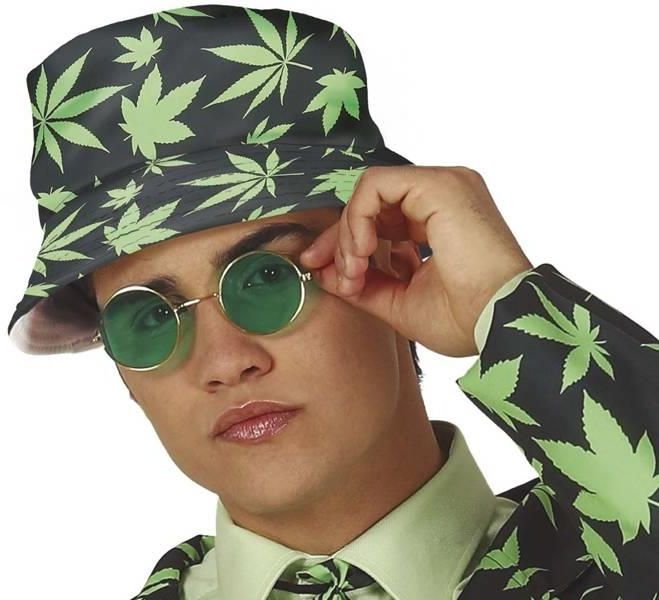 KAPELUSZ W LIŚCIE MARIHUANY Kapelusz w stylu bucket hat. Kolor czarny z nadrukiem zielonych liści marihuany. Wymiary: obwód: ok.56 cm. Idealny na lato albo jako element przebrania. Na pozostałych naszych aukcjach oferujemy: inne produkty z motywem liści marihuany: garnitury imprezowe, naszyjniki, okulary. Kapelusz czapka liście marihuany wakacje