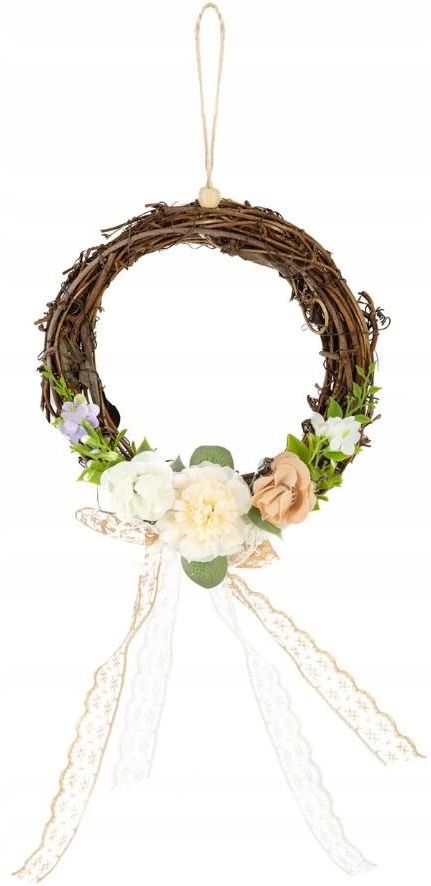 Wianek pleciony wiklinowy z kwiatami - brązowy, 20 cm Wiosenny wiklinowy wianek z kwiatami i koronkowymi wstążkami to subtelna i elegancka dekoracja, która wprowadza do wnętrza lekkość oraz świeżość. Delikatne listki nadają mu naturalny, harmonijny wygląd, a finezyjne koronkowe wstążki dodają romantycznego uroku. Idealnie sprawdzi się jako ozdoba drzwi, okien, ścian lub wielkanocnego stołu, tworząc niesamowity klimat. Wianek posiada sznureczek do wygodnego zawieszenia. KOLOR: brązowy ŚREDNICA: 20 cm OPAKOWANIE: 1 szt.