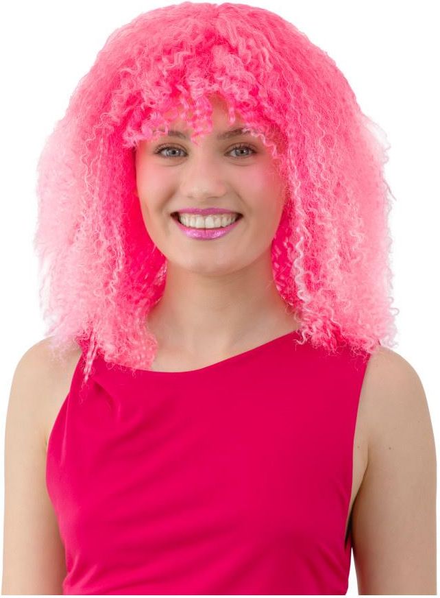 Peruka z kręconymi włosami, średniej długości w kolorze różowym. Świetnie sprawdzi się na karnawał. Rozmiar uniwersalny. Włosy syntetyczne.