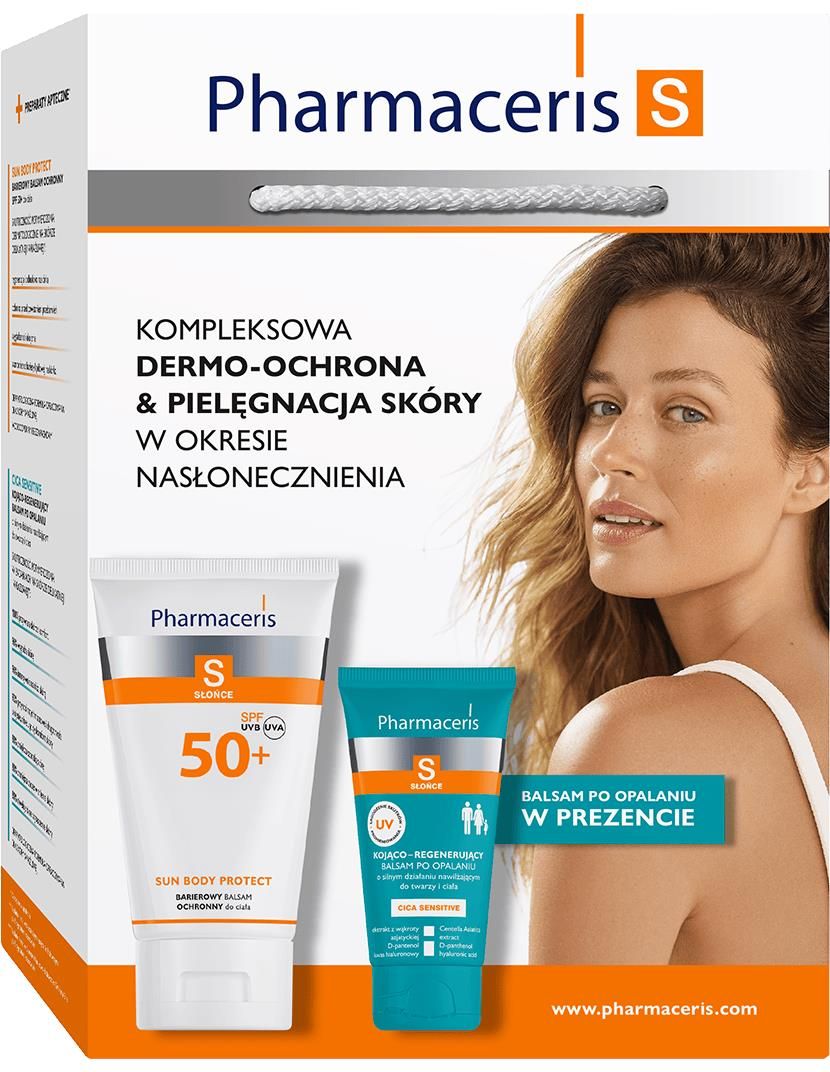 Zestaw Pharmaceris S KOMPLEKSOWA DERMO-OCHRONA & PIELĘGNACJA SKÓRY W OKRESIE NASŁONECZNIENIA Jeden z istotniejszych elementów bezpiecznego lata to OCHRONA PRZECIWSŁONECZNA Stosowanie kremów z filtrem nie tylko chroni przed podrażnieniami i poparzeniami słonecznymi, ale też zabezpiecza skórę przed nadmierną utratą wody i związanym z tym przesuszaniem i szybszym starzeniem. Równie ważna jest PIELEGNACJA SKÓRY PO OPALANIU Naturalną reakcją obronną skóry na wpływ promieniowania słonecznego jest pogrubienie naskórka. W wyniku tego procesu skóra staje się bardziej szorstka w dotyku. Często pojawia się zaczerwienienie, pieczenie, swędzenie skóry. Taka skóra wymaga regeneracji i dostarczenia składników intensywnie nawilżających. SUN BODY PROTECT BARIEROWY BALSAM OCHRONNY do ciała WSKAZANIA: Polecany do ciała dla skóry delikatnej, wrażliwej i problemowej – wymagającej bardzo wysokiej ochrony przed intensywnym nasłonecznieniem, oparzeniami słonecznymi i szkodliwym promieniowaniem UVA/UVB. DZIAŁANIE: W preparacie zastosowano specjalny system fotostabilnych filtrów UVA i UVB, o podwójnym mechanizmie działania antyUV (odbijania i pochłaniania promieni słonecznych) dla zapewnienia skutecznej i bardzo wysokiej ochrony przed intensywnym nasłonecznieniem i jego niekorzystnymi skutkami. Balsam zapewnia ponad 98% ochrone antyUV oraz minimalizuje ryzyko powstawania zmian barwnikowych i przebarwień. Preparat uzupełnia niedobory lipidów. Głęboko nawilża i odżywia skórę tworząc osłonę zabezpieczającą naskórek przed nadmiernym wysuszeniem. Witamina E przyspiesza odnowę naskórka oraz chroni przed fotostarzeniem. Alantoina koi i łagodzi podrażnienia powstałe w wyniku ekspozycji skóry na słońce. Preparat wodoodporny – dostosowany do potrzeb osób aktywnych. Szybko się wchłania i nie pozostawia na skórze tłustej warstwy. Formuła bezpieczna dla środowiska wodnego. SPOSÓB UŻYCIA: Nanieść odpowiednią warstwę balsamu 20-30 minut przed ekspozycją na słońce. Ponawiać aplikację co 2 godziny oraz każdorazowo po kąpieli lub pływaniu. CICA SENSITIVE KOJĄCO– REGENERUJĄCY BALSAM PO OPALANIU o silnym działaniu nawilżającym do twarzy i ciała WSKAZANIA: Balsam do codziennego stosowania, rekomendowany dla skóry suchej, z ogólnym dyskomfortem występującym zwłaszcza po opalaniu lub przedawkowaniu słońca, objawiającym się pieczeniem, zaczerwienieniem i przesuszeniem. Przeznaczony do twarzy i ciała, dla dorosłych i dzieci od 3. roku życia. DZIAŁANIE: Balsam intensywnie regeneruje i nawilża skórę, wykazując działanie łagodzące zaczerwienienia, podrażnienia i dyskomfort jak pieczenie, swędzenie i uczucie gorąca powstałe w wyniku opalania lub nadmiernej ekspozycji na słońce. Kwas hialuronowy i olej ryżowy niwelują silne wysuszenie i szorstkość naskórka, znacząco go wygładzając. Ekstrakt z wąkroty azjatyckiej potęguje działanie nawilżające, jednocześnie opóźniając procesy starzenia skóry. Szybko się wchłania, przywracając skórze komfort i natychmiastowe nawilżenie i ukojenie (D-pantenol, alantoina). SPOSÓB UŻYCIA: Do codziennego stosowania. Nanieść preparat na suchą skórę i delikatnie rozsmarować. W celu lepszego ukojenia pozostawić cienką warstwę, do czasu wchłonięcia. UWAGA: Nadmierne przebywanie na słońcu może stanowić poważne zagrożenie dla zdrowia. Produkty ochrony słonecznej nie zapewniają 100% ochrony.