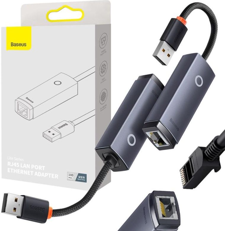 Baseus Erhernet Opis produktu + najważniejsze cechy Adapter sieciowy Baseus Erhernet przejściówka USB-A do RJ45 LAN 100Mbps Adapter od marki Baseus z serii Erhernet to kompaktowa przejściówka, która pozwoli Ci połączyć się z siecią lokalną i uzyskać dostęp do Internetu za pomocą złącza USB-A. Akcesorium zostało wykonane z wysokiej jakości materiałów, dzięki czemu jest wytrzymałe i solidne. Dodatkowo posiada lekką konstrukcję i minimalistyczne kształty, dzięki czemu możemy zabrać przejściówkę ze sobą niemalże wszędzie. Parametry produktu: Waga: 30 g Wymiary: 23x67x17 mm Długość kabla: 225 mm Mottem firmy Baseusjest: "Dzięki naszym użytkownikom oraz dużemu uznaniu wśród klientów, bazując jedynie na usługach wysokiej jakości, chcemy zyskać przewagę na rynku". Wraz z rozwojem, marka Baseus staje się liderem akcesoriów na świecie. Producent Baseus Model Erhernet Materiał Stop aluminium Złącze wejścia USB-A 3.0 Złącze wyjścia RJ45 Prędkość przesyłu danych Do 100 Mbps Baseus ErhernetProdukt od marki Baseus został wykonany z najwyższej jakości materiałów w połączeniu z zastosowaniem najnowszej technologii. Złącze USB-A 3.0 gwarantuje bezpieczny oraz szybki transfer. Kompaktowe wymiary urządzenia sprawiają że będzie idealnym rozwiązaniem podczas projektu w pracy, przedstawiania nowej prezentacji w szkole czy też w trakcie oglądania filmów w domu. Wysoka jakość i precyzja wykonaniaObudowa wykonana ze stopu aluminium dokładnie zabezpiecza urządzenia przed uszkodzeniami oraz jest odporna na zużycie i utlenianie. Wbudowany chipy, najnowocześniejsze układy, wyjątkowa konstrukcja i solidna dwuwarstwowa powłoka zapewniają niezawodność i bezpieczeństwo. Blisko portu Ethernet znajduje się wskaźniki LED, który świeci się po podłączeni udo zasilania. Wbudowany kabel ma aż 22,5 cm długości. Szybki transferPrzejściówka od marki Baseus umożliwia połączenie się z siecią lokalną i uzyskanie dostępu do Internetu za pomocą złącza USB-A. Produkt obsługuje prędkości przesyłania danych do 100 Mb/s. Urządzenie zapewnia szybki transfer danych bez żadnych przerw i opóźnień. Funkcja Plug&Play umożliwia nam korzystanie z urządzenia bez żadnych dodatkwowych oprogramować czy sterowników w systemach Windows 10. W systemach Mac i < Windows 10 potrzebne są sterowniki które są w zestawie.Szeroka kompatybilność Adapter będzie świetnym rozwiązaniem dla laptopów czy też komputerów pozbawionych złącza Ethernet.Urządzenie działa z systemami Windows, Mac OS oraz Linux. Bezproblemowo podłączymy go do takich urządzeń jak laptopy Apple, Notebook'i, komputery, MiBox, tablety, Nintendo Switch i wiele innych.