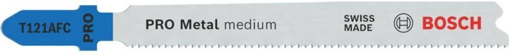 Brzeszczot do wyrzynarek PRO Metal medium T121AFC Wytrzymuje do 2 razy dłużej niż brzeszczot do wyrzynarki Bosch T118A Długotrwałe cięcie metalu o średniej i małej grubości Powłoka AlTiN do trudnych prac w metalu Pasuje do wszystkich wyrzynarek z uchwytem typu T Materiały Długotrwałe cięcie metalu o średniej i małej grubości 1 Powłoka AlTiN do trudnych prac w metalu 2 Zwężany korpus, cienki rzaz i frezowane, faliste zęby zapewniają płynność cięcia PRO Metal medium T121AFC do długotrwałego cięcia metalu o średniej i małej grubości Jeśli jesteś ślusarzem i szukasz mocnego i trwałego brzeszczotu do wyrzynarek do cięcia blach, to mamy dla Ciebie idealny produkt. Wypróbuj nasz PRO Metal medium T121AFC. Wzmocniliśmy jego zęby powłoką, aby zapewnić im odporność na ciepło i utlenianie. Uzyskasz proste cięcie blachy o średniej grubości — raz za razem. Brzeszczot do wyrzynarki PRO Metal medium T121AFC ma konstrukcję „bimetal”: uzębienie ze stali szybkotnącej (HSS) pokryte aluminiową powłoką z azotkiem tytanu (AlTiN) jest połączone z korpusem ze stali wysokowęglowej (HCS), co daje trwałość i wytrzymałość. Geometria zębów — mocne, frezowane, faliste zęby, zwężający się korpus ostrza i cienki rzaz — umożliwia szybką pracę. Brzeszczot nadaje się do cięcia blachy o średniej grubości od 1 do 3 mm.
