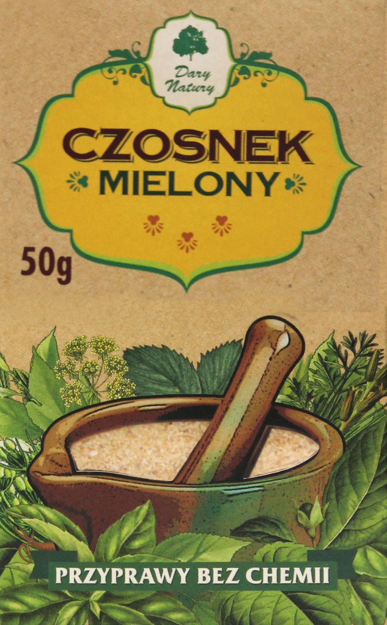 Dary Natury Czosnek mielony 50 g Ekologiczne przyprawy Właściwości Czosnek to kopalnia witamin, minerałów i związków siarkowych. W składzie znajdziemy też fitosterole i flawonoidy. To wszystko sprawia, że mamy do czynienia z niezwykle efektywnym środkiem wpływającym pozytywnie na nasz układ odpornościowy. Sposób użycia Popularna i znana przyprawa do wszystkich potraw, smacznej domowej kuchni. Czosnkiem przyprawia się sery, sałatę, potrawy z grzybów, mięso, dziczyznę, ryby i sosy. Poprawia on smak białego sera, jogurtów oraz pieczywa. Skład Czosnek mielony* 100% *produkt rolnictwa ekologicznego Ważne Produkt nie zawiera konserwantów, barwników, aromatów. Przyprawa ekologiczna. Producent: Dary Natury