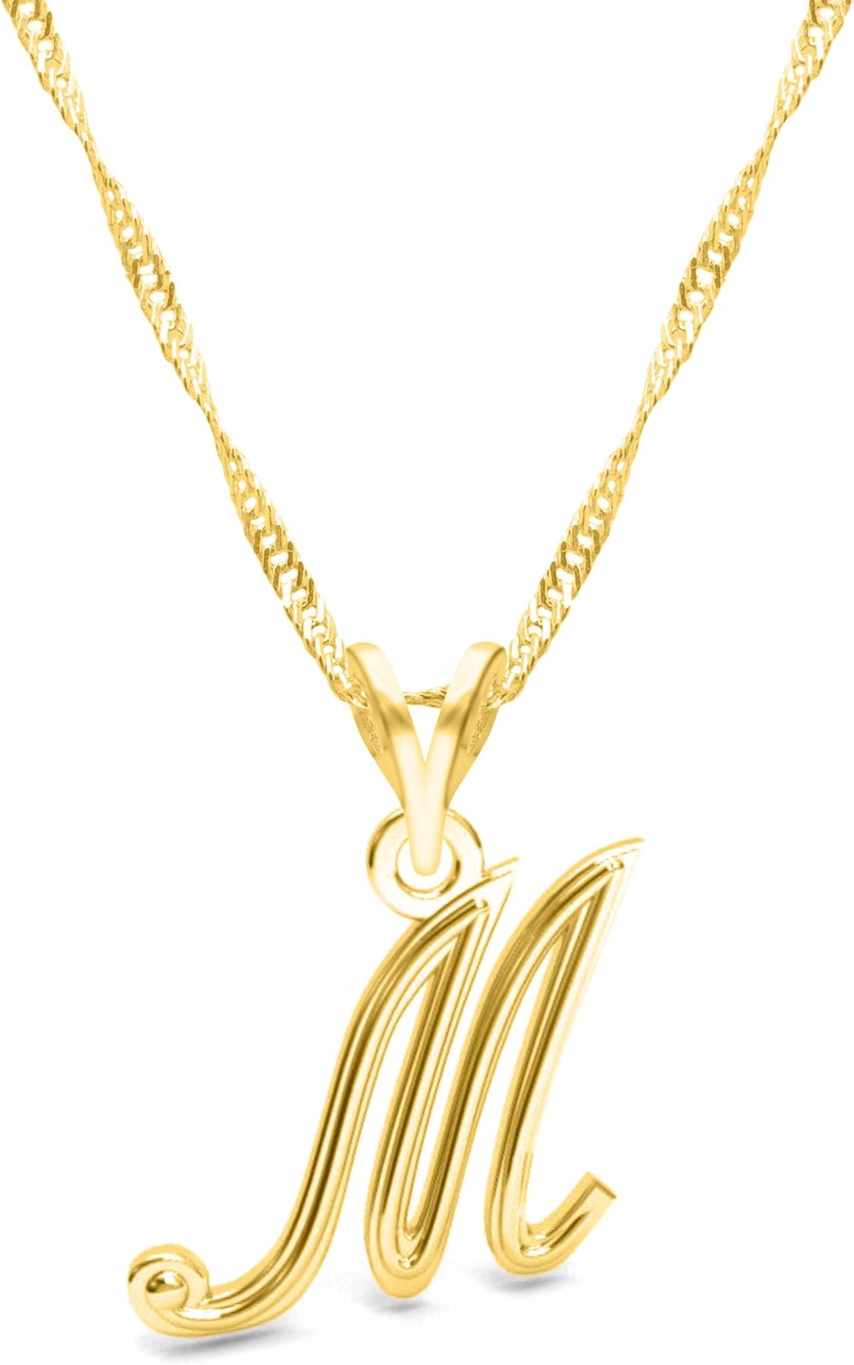 Naszyjnik złoty Litera Literka M ❤️Surowiec: Srebro ❤️Próba: 925 ❤️Powłoka: 4-warstwy żółtego złota próby 999 (24 Karatów) ❤️Kamień: Brak ❤️Typ: Naszyjnik ❤️Długość: 42cm + 3cm (przedłużka w kształcie serc) ❤️Splot łańcuszka: Singapur ❤️Waga: ~2,87 g ❤️Wysokość zawieszki (bez krawatki): 16mm …