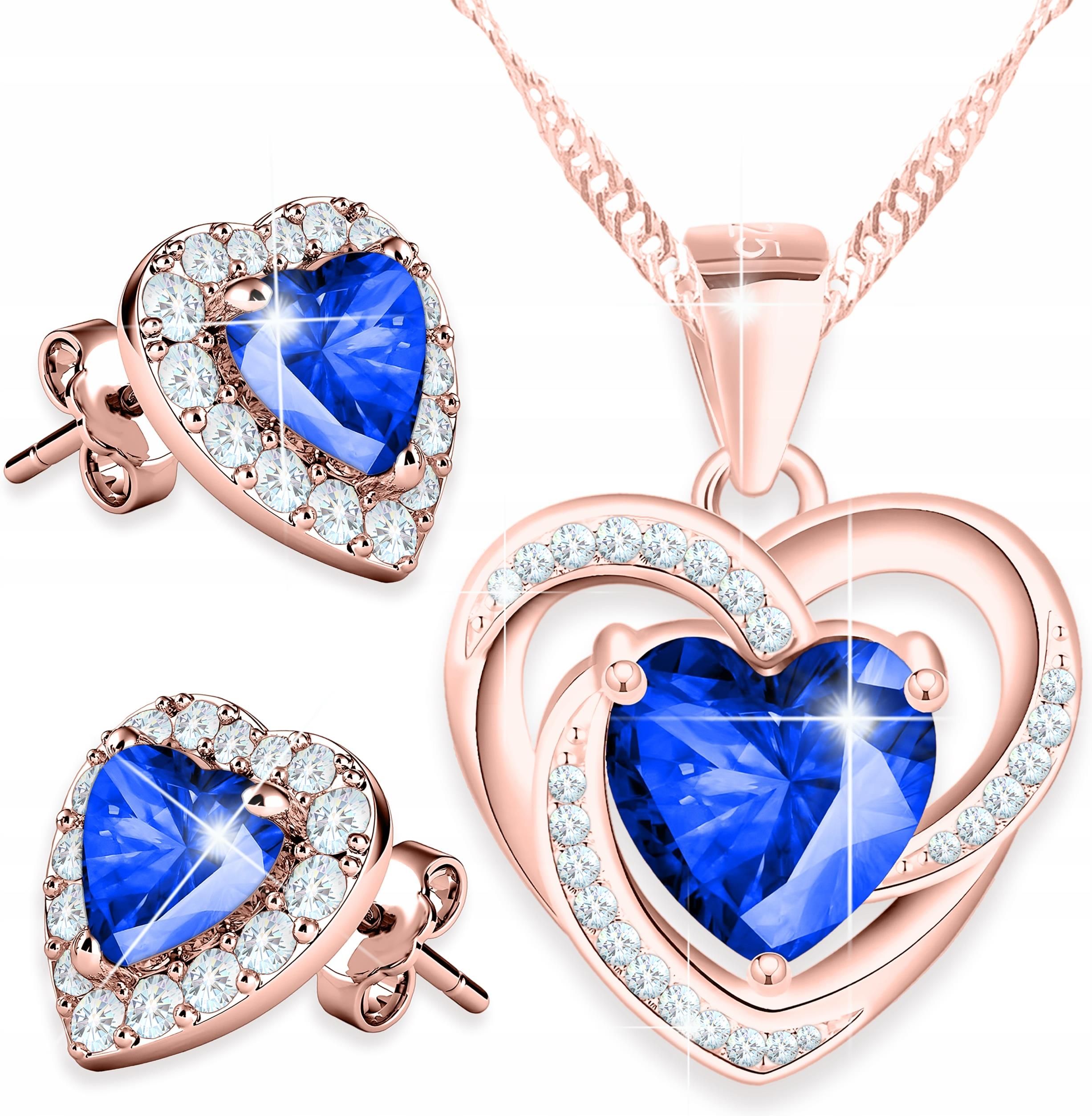 Larezo Pozłacany Zestaw Naszyjnik Kolczyki Niebieskie Kryształowe Serca SREBRO 925 Czchów