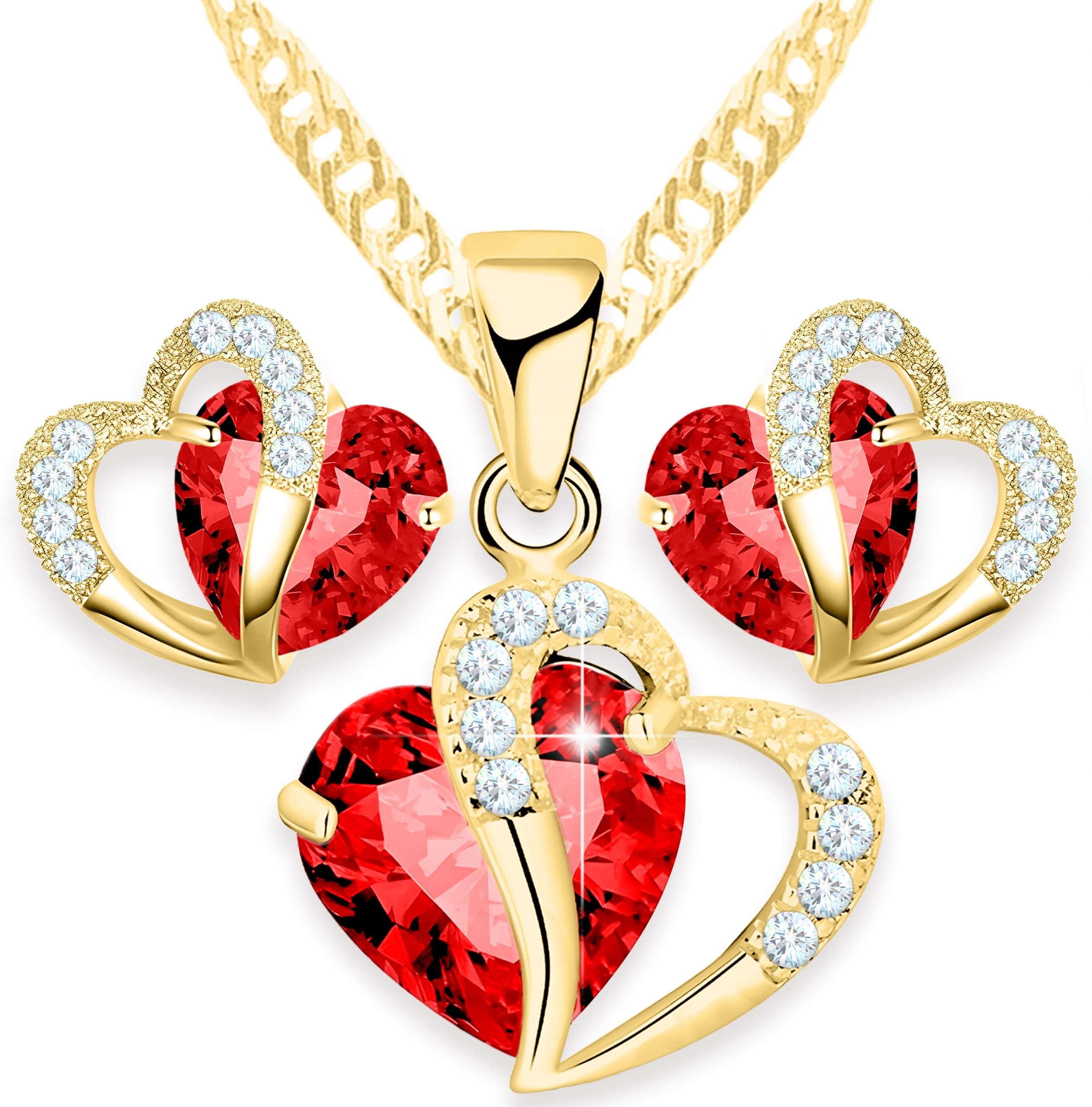 Larezo Zestaw Złoty Naszyjnik I Kolczyki Czerwone Kryształowe Serca Srebro 925 Czchów