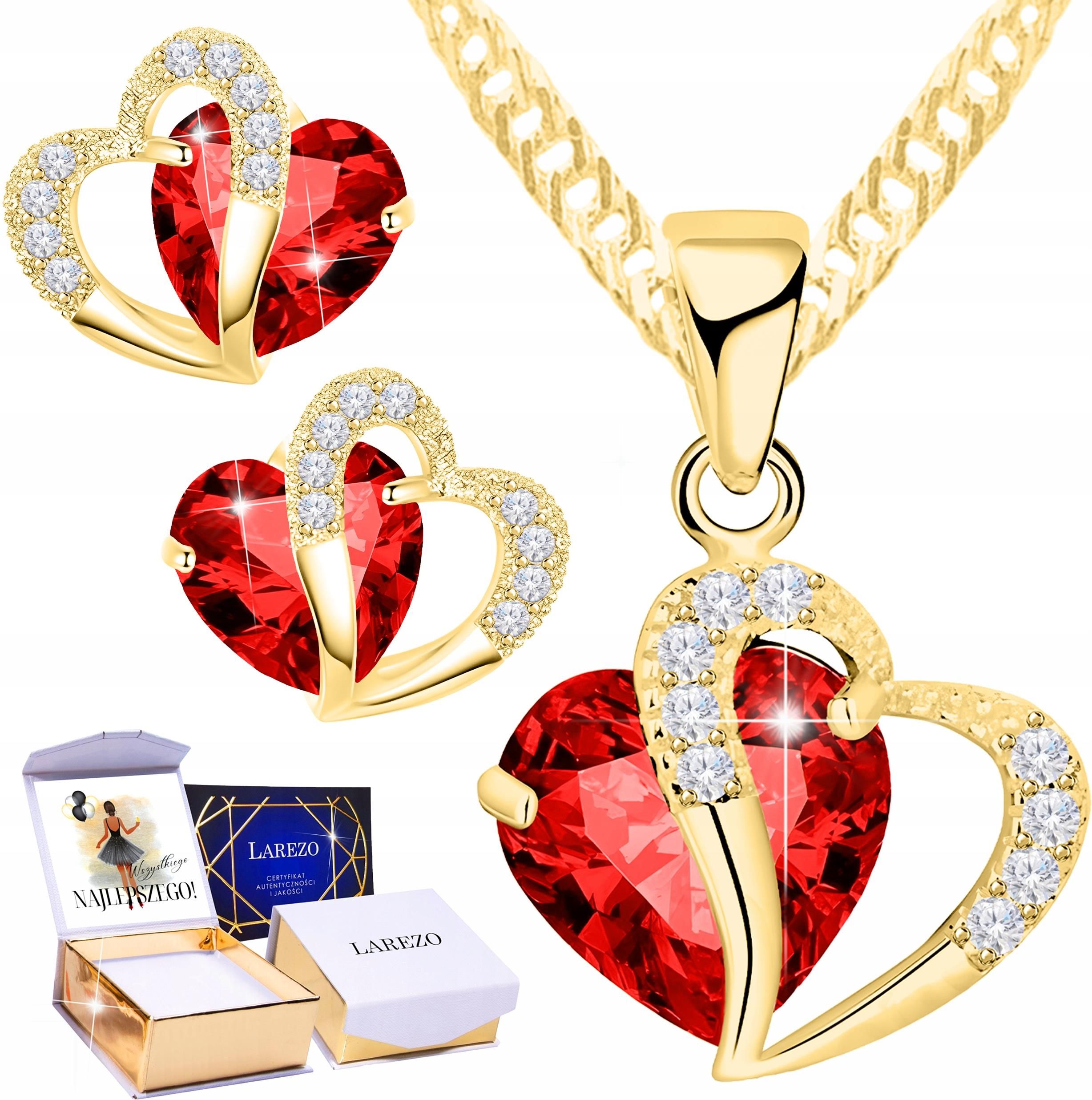 Larezo Zestaw Złoty Naszyjnik I Złote Kolczyki Wkrętki Czerwone Kryształowe Serca Czchów
