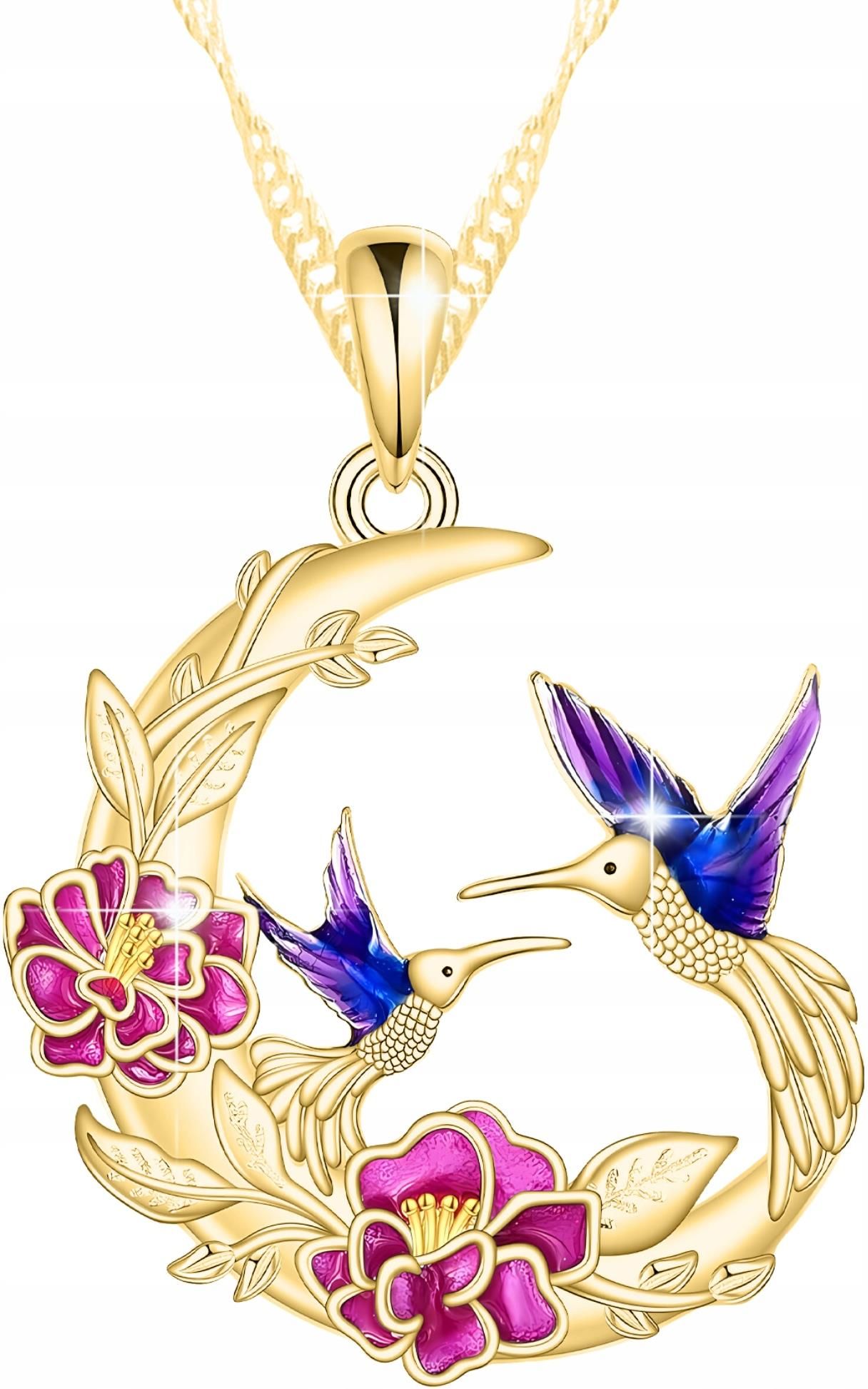 Larezo Złoty Naszyjnik 925 Półksiężyc Ptaki i Kwiaty Ptak Koliber Kwiat Życia 14K Czchów