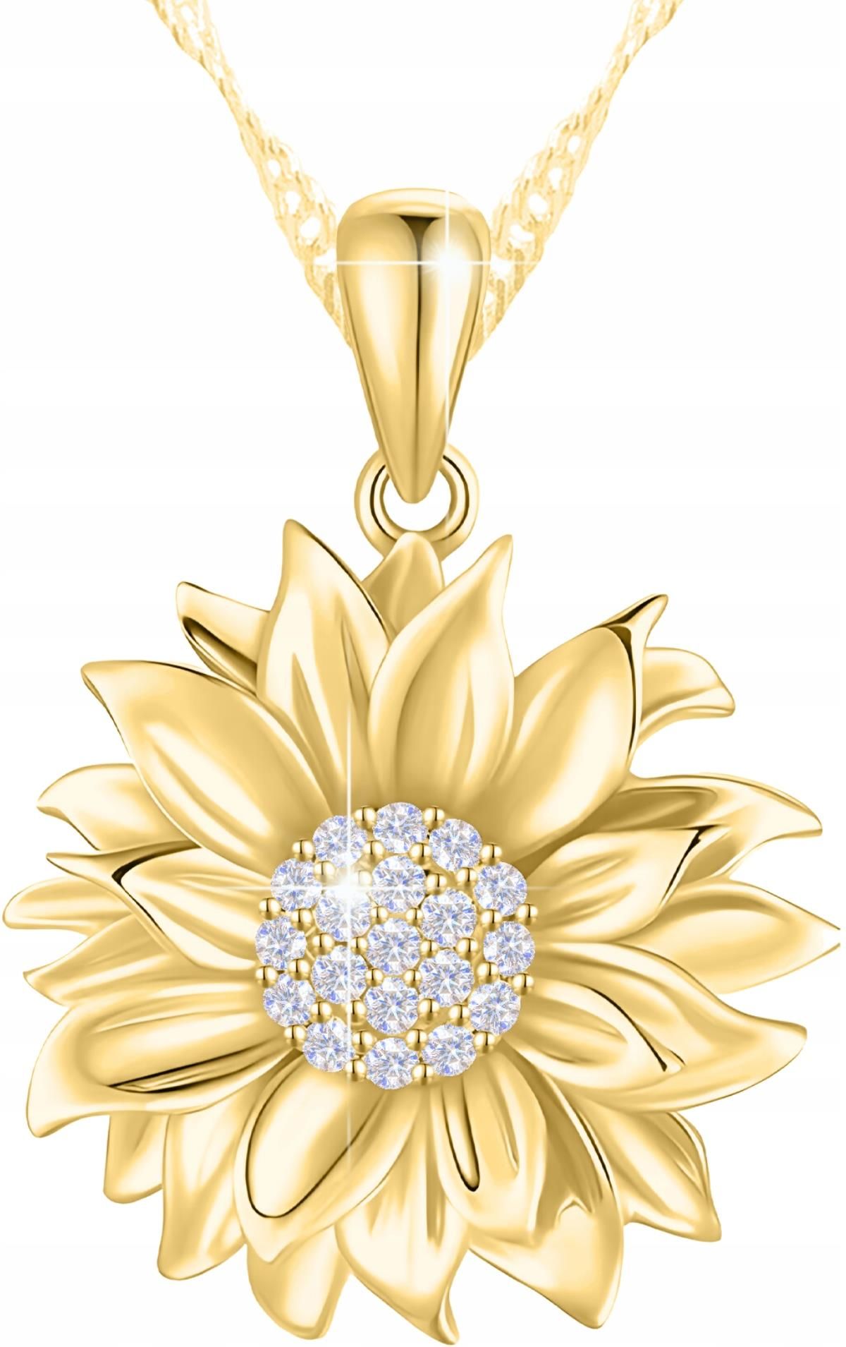 Naszyjnik Słonecznik Surowiec: Srebro Próba: 925 Pokrycie: Złoto pr.585 Długość: 42cm + 3cm Kamienie: Cyrkonie Splot: Singapur Wymiary zawieszki: Wysokość (z krawatką): 22 mm Wysokość (bez krawatki): 17 mm Szerokość: 16 mm Waga: ~3,6g Motyw: Kwiatek / Natura 💎 Srebro nie zawiera domieszek niklu co …