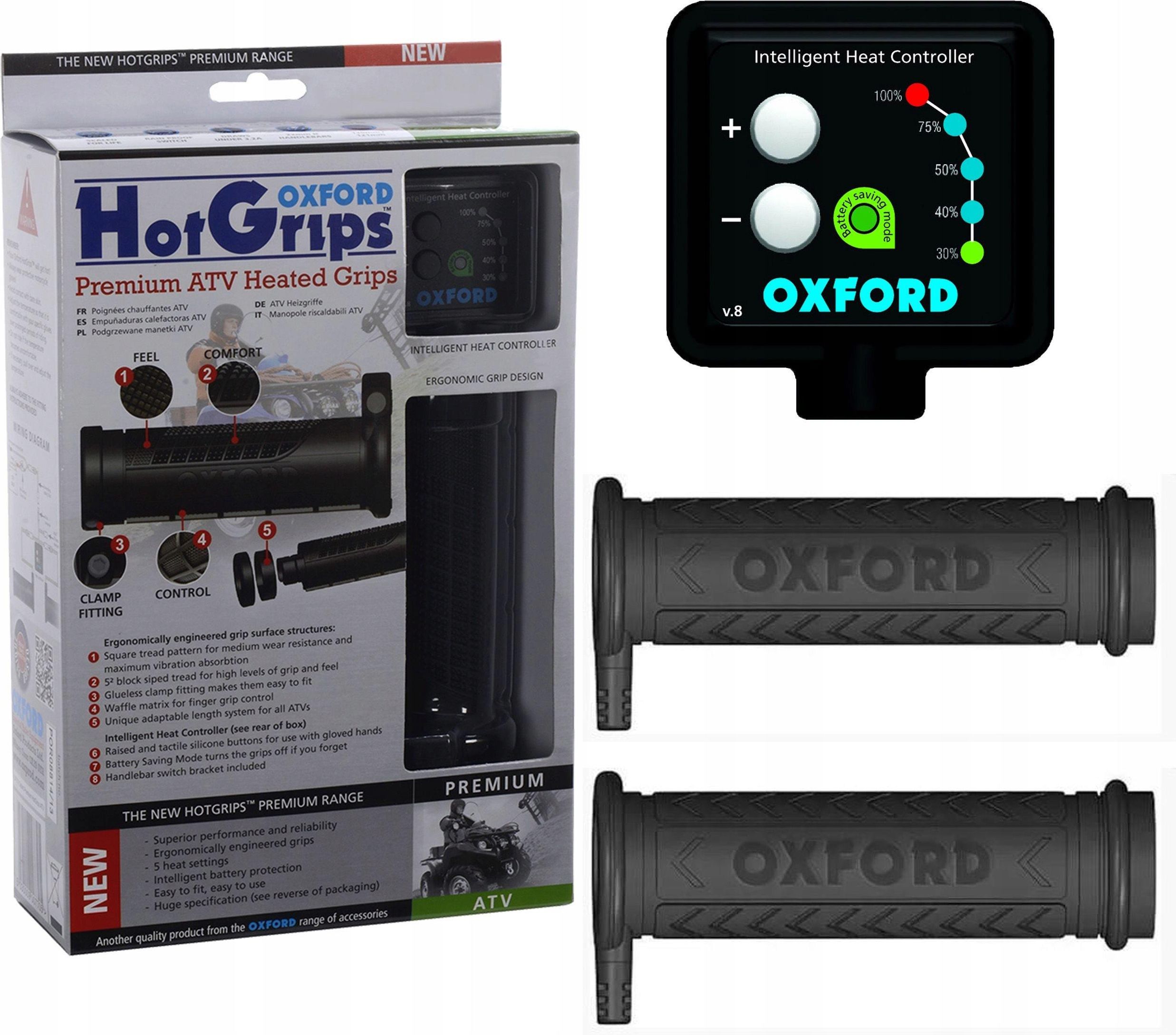 Manetki podgrzewane Oxford Premium ATV zaprojektowane zostały z myślą o quadach oraz pojazdach All-Terrain. Dzięki dodatkowym podkładkom, długość i sposób ułożenia manetek dopasować można do każdego typu kierownicy ATV, a specjalny zacisk umożliwia stabilny montaż bez użycia kleju. W zestawie …