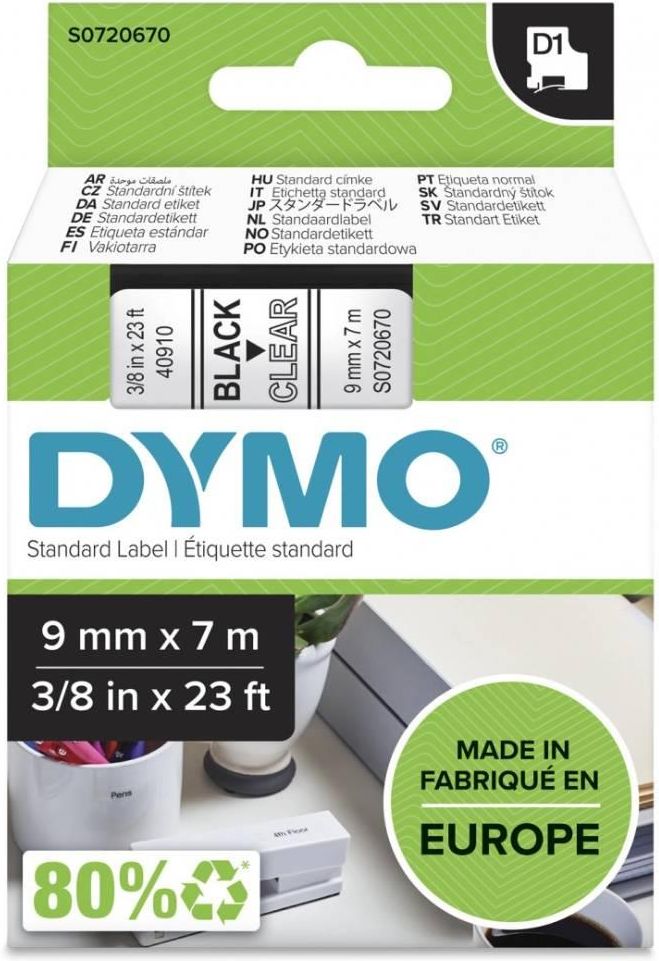 Taśma DYMO D1-40914 9 mm x 7 m / biała / niebieski nadruk / do drukarek DYMO D1 Taśmy Dymo typu D1 o wymiarach 9 mm na 7 metrów stworzono specjalnie dla twojej drukarki etykiet Dymo Label Manager, Rhino lub Label Point. Standardowe taśmy Dymo D1 wykonano ze specjalnego tworzywa sztucznego, idealnego do tzw druku sublimacyjnego. Przyklejają się praktycznie do wszystkich czystych powierzchni takich jak: plastik, papier, metal, drewno czy szkło. Posiadają łatwo usuwalną przekładkę, która umożliwia szybkie i proste naklejanie, wystarczy zgiąć w środku i odkleić. Taśmy Dymo D1 można jednak łatwo usunąć, gdy zajdzie taka potrzeba i co ważne nie pozostawia śladów po kleju. Taśmy Dymo D1 wytrzymują również pod działaniem wody, olejów lub łagodnych rozpuszczalników. Są także odporne na działanie promieni UV - nie blakną oraz nie łuszczą się. Klej na taśmach Dymo D1 nie traci swoich właściwości w temperaturze od -18 do +90 stopni Celsjusza.   Najważniejsze zalety taśmy Dymo D1 o wymiarze 9 mm  w kolorze białym Taśmy D1 pakowane są w poręczne kasetki, łatwo włożysz je do swojej drukarki Dymo i rozpoczniejsz pracę Taśmy Dymo posiadają łatwo usuwalną przekładką zabezpieczającą, która ułatwia jej przyklejanie Do Taśm Dymo D1 nie potrzeba tonera ani tuszu - wystarczy głowica termiczna w Twojej drukarce Dymo Masz duży wybór taśm D1 w różnych kolorach Nadruk na taśmach D1 jest bardzo trwały  Tekst w kolorze niebieskim   Gdzie można stosować taśmy Dymo D1 9 mm x 7 m W biurze do oznaczania segragtorów, szafek, półek, sprzętu elektronicznego W warsztacie do oznaczania narzędzi, skrzynek, urządzeń elektrycznych W skepie do oznaczania towaru W domu do oznacznia słoikow, butelek, pojemników do przechowywania    Taśmy Dymo D1 o wymiarach 9 mm na 7 m możesz stosować w następujących drukarkach Dymo Seria drukarek Label Manager: Label Manager PnP, Label Manager 120P, Label Manager 160, Label Manager 220P, Label Manager 210D, Label Manager 260P, Label Manager 280 , Label Manager 360D, Label Manager 420P, Label Manager 450D Seria drukarek Label Point: Label Point 100, Label Point 200, Label Point 250, Label Point 300, Label Point 350 Drukarka Label Writer 450 Duo Drukarki przemysłowe typu Rhino   Uniwersalne taśmy Dymo D1 9 mm x 7 m to idealny wybór dla domu lub biura.