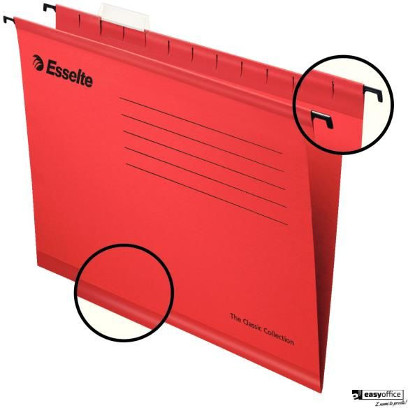 Ta wzmocniona teczka zawieszkowa Esselte pomaga łatwo i wygodnie organizować i klasyfikować papiery i dokumenty.Ta teczka na dokumenty jest 10 razy mocniejsza niż wcześniej dzięki dodatkowemu paskowi wzmacniającemu na krawędziach. Kodowanie kolorystyczne jest teraz łatwiejsze dzięki jasnym kolorom. Ponadto teczka jest wyposażona w przezroczysty plastikowy uchwyt na etykiety i pasujące białe etykiety papierowe. Możesz oznaczyć każdy plik, aby łatwo go rozpoznać i zaoszczędzić dużo czasu na szukaniu tego, którego potrzebujesz.Kolor: czerwonyMateriał: tektura siarczanowa z recyklinguRozmiar: 34,5 x 24 cm (dł. x szer.)Odpowiedni dla formatu A410 razy mocniejszy niż wcześniejProsta klasyfikacja kolorystycznaZ przezroczystym plastikowym uchwytem na etykietyZ pasującymi białymi papierowymi etykietami Koperty wiszące Esselte z kolekcji Classic wykonane z wytrzymałej tektury. Wyprofilowane dno opakowania pozwala na zwiększenie pojemności do 30 mm. Opakowanie zawiera wysuwany indeks wykonany z przezroczystego tworzywa sztucznego z wymienną papierową etykietą. Format A4, rozpiętość prowadnicy 330 mm. Kolor: jaskrawoczerwony Opakowanie: 25 szt Teczki wiszące Esselte Classic są efektownie czerwone i nadają archiwum prosty kod kolorystyczny. Są one wzmocnione na górze i na dole, dzięki czemu można je łatwo zapełnić. Ta teczka wisząca jest wykonana w 100% z kartonu rzemieślniczego pochodzącego z recyklingu i jest do 10 razy mocniejsza niż standardowa teczka. Podróżne okienko z paskami ułatwia przejrzystość zawartości. Opakowanie zawiera 25 teczek wiszących. Specyfikacja produktu (lista HTML): - 10 razy mocniejsza dzięki paskom wzmacniającym zastosowanym wzdłuż krawędzi teczki wiszącej - zawiera sterownik ściegu 50 mm i paski jezdne - materiał w 100% z recyklingu - certyfikat Blue Angel (Błękitny Anioł) Esselte Pendaflex. Format: A4, Materiał: Karton, Kolor produktu: Czerwony. Szerokość: 345 mm, Głębokość: 240 mm. Ilość w opakowaniu: 25 sztuk
