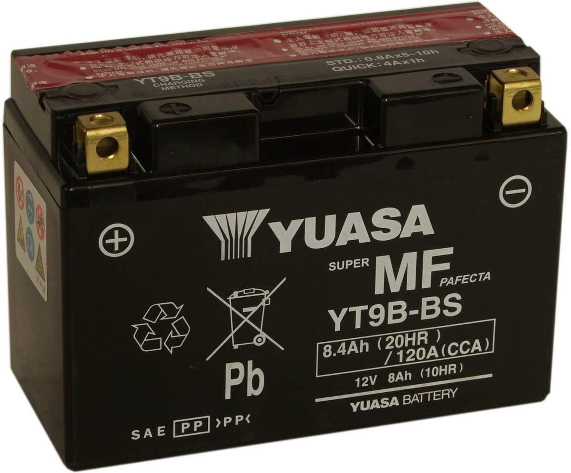 Nr handlowy: YT9B-BS , YT9B-4 Producent: Yuasa Napięcie: 12 V Pojemność: 8.4 Ah Prąd rozruchowy: 120A (CCA -18ºC) Polaryzacja: Lewy plus, 1 Końcówki biegunowe 11 Technologia: Absorbed Glass Mat (AGM) Wymiary: 150 mm (długość), 70 mm (szerokość), 105 mm (wysokość) Waga: 3.4 Kg Dodatkowe informacje: …