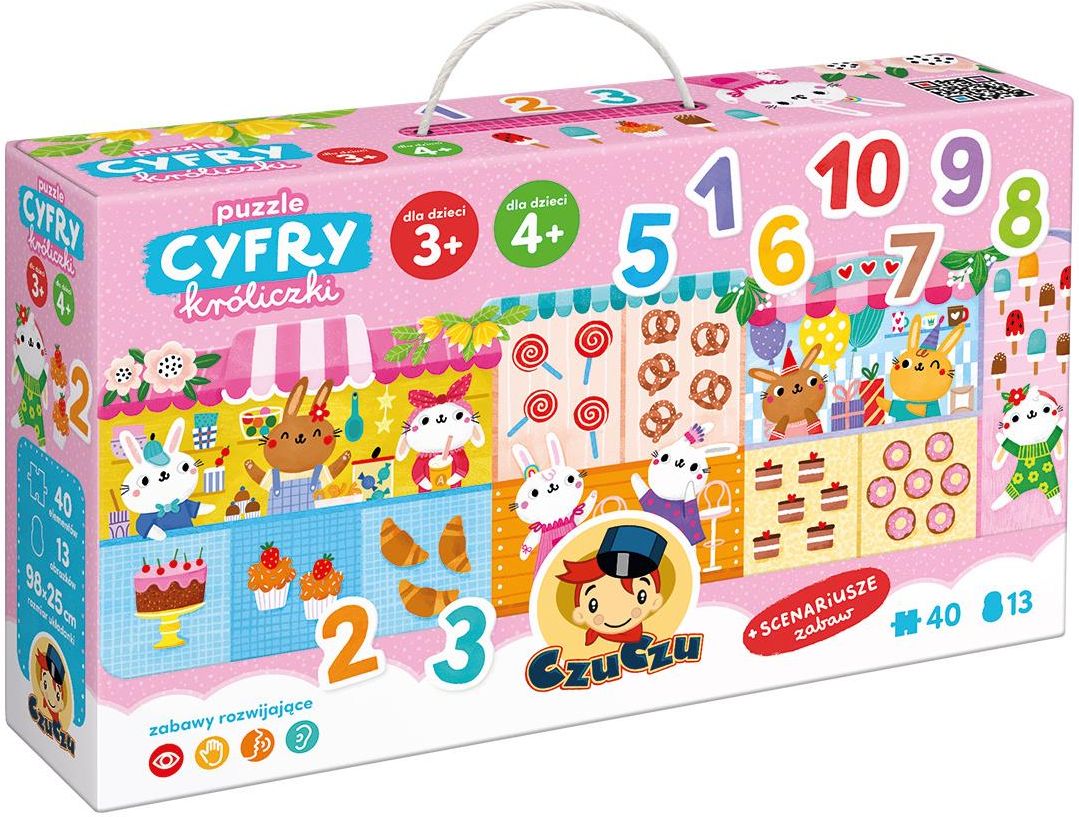 Hej, dzieciaki! Zajrzyjmy razem do kawiarenki króliczków! Puzzle Cyfry Króliczki dla dzieci w wieku przedszkolnym to edukacyjny zestaw, który zainspiruje do mnóstwa ciekawych aktywności, inspirowanych liczeniem. W środku znajdziecie duże puzzle, dokładane cyferki i obrazki oraz poradnik pełen pomysłów na rozwijające aktywności. Bawcie się na wiele różnych sposobów! Ułóżcie puzzle 40 elementów to wyzwanie i radość dla przedszkolaka. Ułóżcie uroczą kawiarenkę i poznajcie króliczki. Bystre oko Dokładnie przyjrzyjcie się ilustracji. Jakie smakołyki przygotowały króliczki? Czy potraficie je wszystkie nazwać? Cyfry i liczby Poznajcie kształty cyfr. Liczcie smakołyki i dopasujcie do nich odpowiedni element, poznając w ten sposób wartości odpowiadające poszczególnym cyfrom. Liczymy do 10 Bawcie się, doskonaląc liczenie do 10. Let’s count to 10! Możecie wykorzystać zestaw do nauki innego języka. Kredki w dłoń! Narysujcie smakołyki, które także mogłyby się znaleźć w kawiarence. A może przyjaciół króliczków? To dopiero początek – w poradniku dołączonym do zestawu znajdziecie jeszcze więcej pomysłów na wesołe zabawy! 3, 2, 1… zabawa start! W pudełku znajdziecie: puzzle (40 elementów) 13 dokładanych obrazków scenariusze zabaw Wymiary układanki: 85 x 25 cm Wymiary pudełka: 33 x 19 x 7 cm Ilustracje, formę i treść dostosowaliśmy do wieku dziecka Puzzle wymyśliliśmy i wyprodukowaliśmy w Polsce Zilustrowała Agnieszka Malarczyk