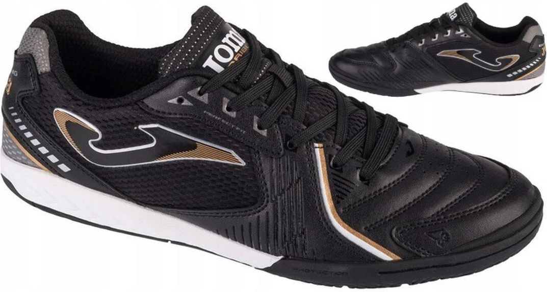 Buty halowe piłkarskie halówki futsal JOMA Dribling 2401 IN na halę R. 45 BUTY JOMA DRIBLING 2401 IN Cholewka: SYNTETYK Technologia: PROTECTION Podeszwa: guma DURABILITY System: VTS Sznurowanie: PERFECT FIT Rozmiar: 45 Długość wkładki: 30 cm Buty do futsalu typu uniseks. Model w kategorii ekonomicznej polecany dla początkujących lub amatorskich piłkarzy. Te wszechstronne buty są idealne dla młodych obiecujących graczy halowej piłki nożnej, którzy pragną trenować i grać w komfortowych warunkach. Cholewka wykonana z połączenia różnych materiałów. Z jednej strony elementy z PVC zapewniają odporność i dobry kontakt z piłką. Aby zoptymalizować oddychalność i lekkość, dodano tekstylne elementy z perforacjami VTS, które pomagają utrzymać stopę w stałej temperaturze przez cały czas. Lekki tekstylny język i sznurowanie PERFECT FIT zapewniają wsparcie i dokładne dopasowanie. Na czubku zastosowano technologię PROTECTION, czyli chroniące przed uderzeniami i reaktywujące uderzanie piłki gumowe wzmocnienie. Podeszwa zewnętrzna wykonana jest w jednym kawałku z wysokiej jakości gumy DURABILITY, która jest odporna na ścieranie i gwarantuje dobrą przyczepność do podłoża halowego. Zastosowanie kształtów geometrycznych ROTATION, zapewnia bezpieczne skręty i zapobiega potencjalnym kontuzjom. Ponadto, zastosowanie elastycznych linii FLEXO sprawia, że but odznacza się niezrównaną elastycznością.