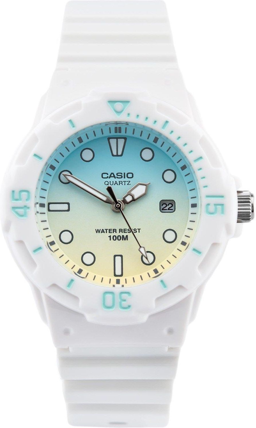 Casio LRW-200H-2E2V to damski zegarek analogowy, dedykowany dla kobiet w różnym wieku. Zegarek Casio LRW-200H-2E2V wykonany jest z surowców najwyższej jakości. Materiał paska i koperty to tworzywo sztuczne - niesamowicie elastyczny i wytrzymały, łatwy w czyszczeniu. Jest wyposażony w datownik, obracający bezel oraz Neobrite - rodzaj pokrycia tarczy, który sprawia, że ta delikatnie świeci w ciemnościach, nawet po krótkim naświetleniu. Klasa wodoszczelności zearka jest na poziomie WR100 / 10 ATM / 10 bar, dzięki czemu zegarek jest odporny na ciągły kontakt z wodą. Można się w nim kąpać, pływać, nurkować na małe głębokości. Jednak, nie zaleca się wciskać przycisków, gdy zegarek znajduje się pod wodą. Kwarcowy mechanizm zegarka jest napędzany baterią typu SR626SW, termin żywotności której wynosi 3 lata. Kolorystycznie zegarek wygłąda bardzo atrakcyjnie: jest biały z żółtą-niebieską tarczą. Takie połączenie kolorów sprawia, że zegarek świetnie prezentuje się na nadgarstku i przyciąga do siebie uwagę. Wszystkie zegarki Casio oferowane w naszym sklepie są oryginalne, fabrycznie nowe, zapakowane w pudełko, mają 3 letnią gwarancję sklepu. Ponadto, istnieje możliwość rozszerzenia gwarancji zegarka Casio LRW-200H-2E2V o dodatkowe 3 lata! Każda transakcja w naszym sklepie jest potwierdzona paragonem albo fakturą VAT. Zegarek Casio LRW-200H-2E2V Youth Series, analogowy, na pasku, damski, dla dzieci i młodzieży, 100 m/WR100/10 ATM, Datownik, Neobrite, obracający bezel DANE OGÓLNE Przedmiot - Casio LRW-200H-2E2V Kolekcja - Youth Series Kraj pochodzenia - Japonia Gwarancja - 3 lata. Komplet zakupu - Zegarek Casio LRW-200H-2E2V, pudełko, instrukcja obsługi, karta gwarancyjna. Kod EAN - 4971850989080 DANE TECHNICZNE Module - 3363 Wodoszczelność 10 bar / WR100 / 10 ATM - Zegarek jest odporny na kontakt z płytką wodą, na przykład, podczas kąpięli lub pływania. Jednak nie zaleca się wciskać przycisków pod wodą. Szkiełko - Akrylowe. Rodzaj szkiełka latwy do czyszczenia i wypolerowania. Żywotność baterii - 3 lata, bateria typu SR626SW OPIS FUNKCJI Neobrite - Luminescencyjne wskazówki i indeksy, święcące się w ciemności po krótkim naświetleniu dowolnym źródłem światła. Datownik - Tak, dzień miesiąca. Obracający bezel - Funkcja przydatna dla monitorowania czasu wykonywania dowolnej czynności, na przykład, przebywania się pod wodą podczas nurkowania. TARCZA Kolor tarczy - Żółty, niebieski Kolor bezela - Niebieski Typ tarczy - Analogowa Indeksy - Cyfry arabskie, kropki, kreski. KOPERTA Materiał koperty - Tworzywo sztuczne Kształt koperty - Okrągły Kolor koperty - Biały PASEK Materiał paska - Tworzywo sztuczne Kolor paska - Biały Zapięcie - Na sprzączkę. Najbardziej popularny rodzaj zapięcia do paska ze względu na praktycznośc i niezawodnośc. WYMIARY Szerokość koperty - 34.2 mm Wysokość koperty - 38.9 mm Grubość koperty - 11.5 mm Szerokość paska - 15 mm Obwód zegarka (koperta + pasek) - 13-19,5 cm Waga - 25 g