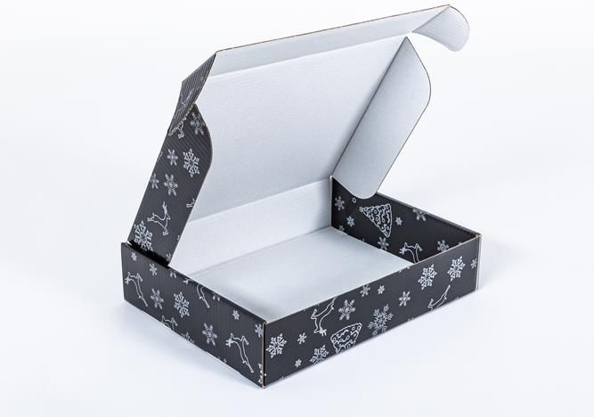 Komplet czarnych kartonów świątecznych - 10 szt. Wymiary zewnętrzne: 400x300x90mm (długość x szerokość x wysokość) Opakowanie wykonane jest z tektury falistej 3-warstwowej, fala B 460 g/m2