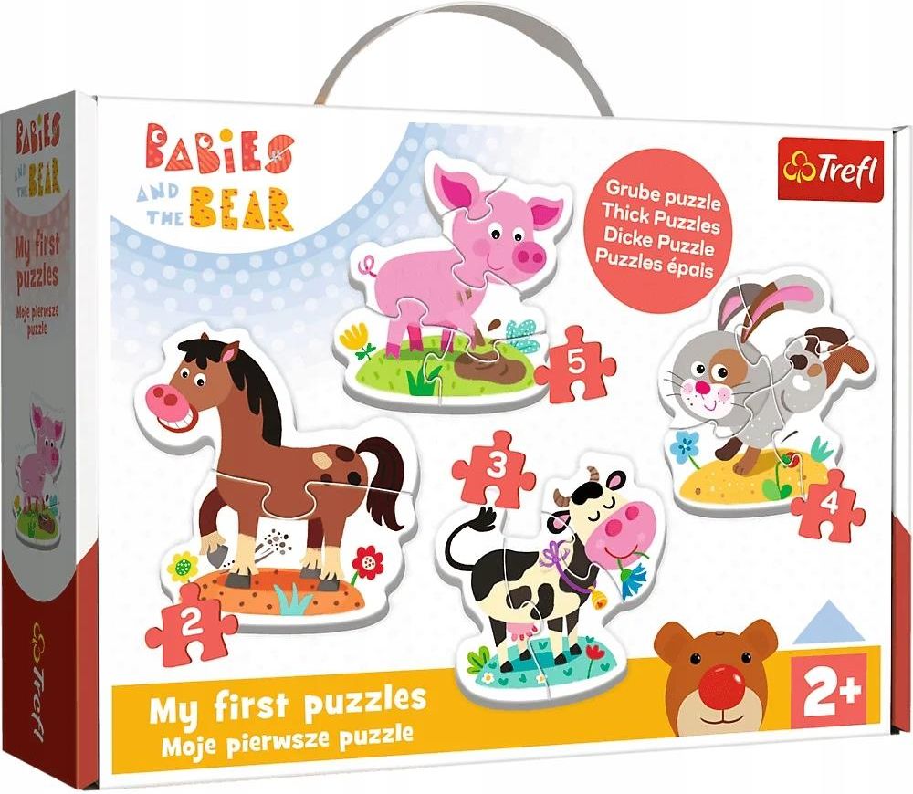 Trefl Puzzle Baby Classic 14el. Na farmie 36127 Zestaw grubych puzzli ze zwierzętami składa się z 4 osobnych obrazków z różną ilością elementów. Zestaw ten umożliwia ułożenie czterech różnych zwierząt. Puzzle są wykonane z grubego papieru eliminującego odbijanie światła oraz z ekologicznych …