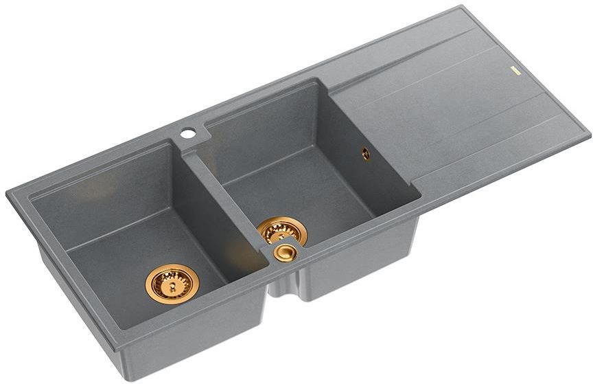 EVAN 121 GraniteQ zlewozmywak z syfonem Push To Open 2-komorowy z/o (1160x500x210; kom. 420x340) silver stone / elementy miedziane Czeladź