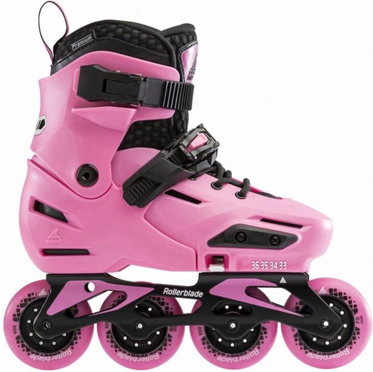 Rolki regulowane dziecięce freeride Rollerblade APEX XC G pink/white Rozmiar EUR 33-36,5 / 21cm - 23cm INFORMACJE O PRODUKCIE Skorupa twarda, wentylowana, formowona - regulowana w zakresie 4 rozmiarów dodatkowo wzbogacona o slider boczny. Wkład wewnętrzny /Liner Junior urban z system tłumienia drgań i wstrząsów SHOCK Absorber Amortyzacja - ShockEraser - wkładka poliuretanowa tłumiąca wstrząsy. Dodatkowo pochłania drgania i wibracje powstałe podczas jazdy po niezbyt równym miejskim podłożu. Szyna aluminiowa / płoza aluminiowa. Nowa Extruded Alu szyna profilowana w rocker195mm(185), 213mm(210), 219mm(235) umożliwia ustawienie kół w popularnie zwany "banan lub klasycznie na plasko - Flat Wiązanie - Mocna i precyzyjna klamra umieszczona pod kątem 45°, trwała górna klamra oraz mocne sznurowanie - stanowią stabilne mocowanie, gwarantujące doskonałe dopięcie buta, komfort i precyzję. KÓŁKA RB zależnie od rozmiaru rolek, rozmiar 18,5 - 2x64mm + 2x62mm, rozmiar 210 - 2x70mm + 2x68mm, rozmiar 235 - 2x72mm + 2x70mm bardziej wytrzymałe niż klasyczne koła stosowane w rolkach dziecięcych. Wolniej się ścierają zmniejszając koszt eksploatacji sprzętu ŁOŻYSKA SG 7 HAMULEC - dołączony w opakowaniu. Firmę ROLLERBLADE można uznać za twórcę rolkarstwa. Od 1980 roku produkty tej firmy są punktami odniesienia dla wszystkich innych firm z branży. To ona wyznacza standardy jakości, komfortu i osiągnięć w rolkarstwie. Wyjątkowe rolki dziecięce w twardej skorupie - Rollerblade Apex XC model dedykowany do nauki oraz podstaw jazdy freestylowej, slalomowej i freeridowej. Twarda skorupa zmniejsza ryzyko kontuzji, jest bardziej odporna na uszkodzenia mechaniczne. Lepiej trzyma stopę co przekłada się na większą kontrolę oraz precyzję podczas jazdy i ćwiczeń slalomowych. Wersja XC umożliwia ustawienie kół Rocker popularnie zwany "bananem" lub klasycznie - Flat