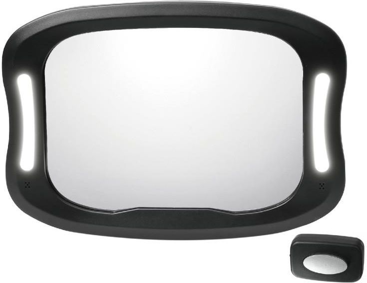 TB-7004 Lusterko do obserwacji dziecka z podświetleniem LED i pilotem Lusterko do obserwacji dziecka z podświetleniem LED i pilotem Duże, regulowane lusterko samochodowe z oświetleniem LED holederskiej marki Titanium Baby to niezwykle praktyczny przedmiot podczas jazdy samochodem, który pozwoli obserwować dziecko w foteliku, usadzone tyłem do kierunku jazdy. Lusterko to zostało zaprojektowane, aby pomóc rodzicom mieć oko na swoje dziecko podczas jazdy, jest mocowane do zagłówka tylnego siedzenia. Funkcja LED może zapewnić dodatkową widoczność lub delikatne światło, aby pomóc monitorować dziecko w warunkach słabego oświetlenia. Delikatne światło nie obudzi śpiącego dziecka. Oświetlenie można włączać i wyłączać za pomocą dołączonego pilota. Pilot może być zawieszony za pomocą klipsa w miejscu, które jest w zasięgu ręki, aby wspólne podróżowanie było bezpiecznie i wygodnie.Obrotowy mechanizm pozwala regulować kąt ustawienia 360 stopni w zależności od ułożenia dziecka, budowy foteli w aucie, czy innych, indywidualnych czynników. • Może być obsługiwane z fotela kierowcy za pomocą poręcznego pilota • Nietłukące szkło Clear-Sight zapewnia doskonałe odbicie lustrzane bez zniekształceń • Lekka rama Soft Touch • Energooszczędne oświetlenie LED i regulacja kąta nachylenia 360 stopni • Pasuje praktycznie do każdego samochodu z zagłówkiem dzięki poręcznym paskom montażowym • Wymiary: 28,5 cm x 20 cm - duże i wygodne • Działa na baterie (brak w zestawie): -Lustro 3 x baterie AA - Pilot: 2 baterie AAA Marka: Titanium Baby Wielkość opakowania: 29 x 8 x 21 cm Eko-opakowanie eleganckie tekturowe pudełko.