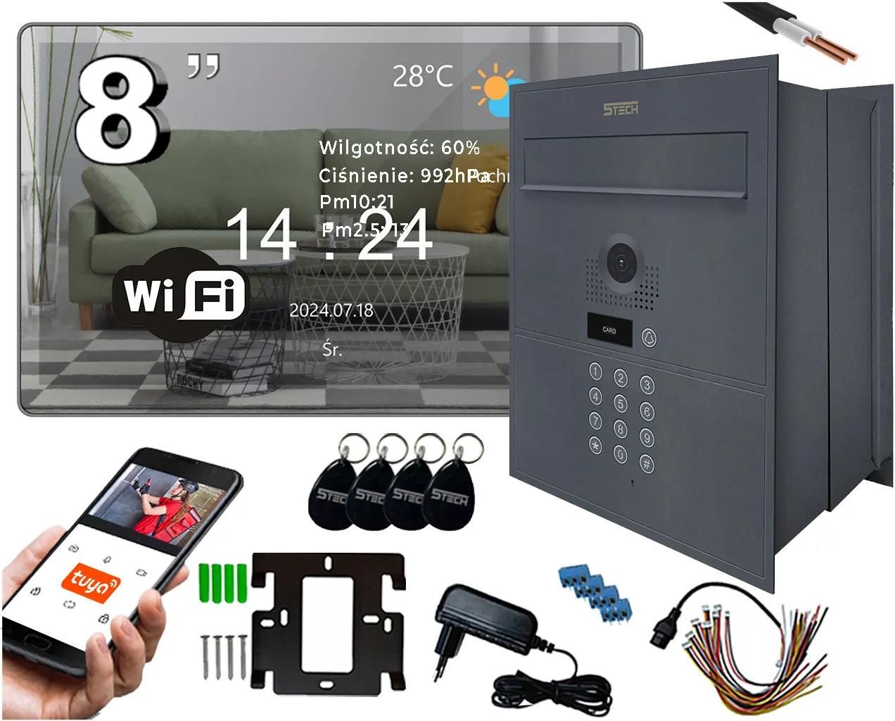 W skład zestawu wchodzi: Wewnętrzny monitor 2-wire LCD 5Tech Virgo Plus 8" Lustrzany Stacja bramowa 5Tech 82218G Skrzynka przelotowa na listy Zasilacze sieciowe Przewody montażowe Zestaw montażowy Instrukcja Uchwyt ścienny na monitor