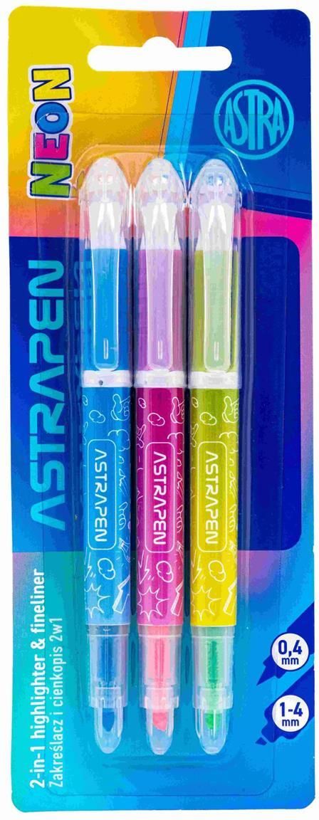 Zakreślacz i cienkopis 2w1 ASTRAPEN – kreatywność w neonowym stylu! ✨🖍️ Połącz funkcjonalność i zabawę dzięki zakreślaczom i cienkopisom 2w1 od ASTRAPEN. Zestaw 3 sztuk w żywych neonowych kolorach to idealne narzędzie do notatek, kreatywnego pisania i oznaczania najważniejszych informacji. …